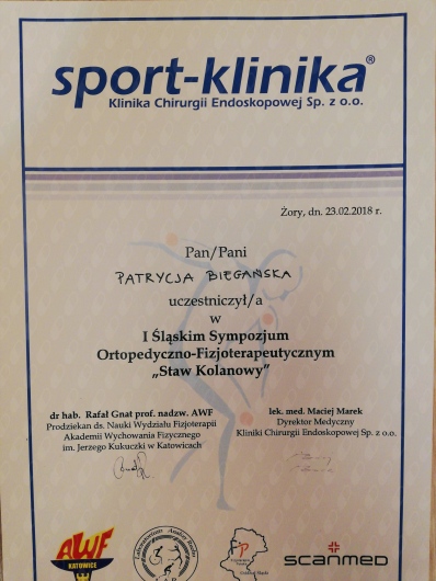 - I Śląskie Sympozjum Ortopedyczno - Fizjoterapeutyczne "Staw kolanowy"; Sport-Klinika Żory