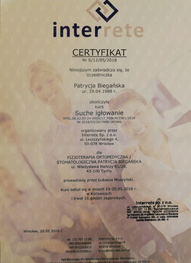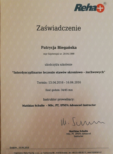 Jaki jest zakres porad oferowanych przez Patrycja Biegańska?Patrycja Biegańska to fizjoterapeuta. Na podstawie swojego doświadczenia i wykształcenia Patrycja Biegańska oferuje usługi takie jak: konsultacja fizjoterapeutyczna (pierwsza wizyta), Terapia manualna, kinesiotaping, konsultacja fizjoterapeutyczna, taping (plastrowanie), rehabilitacja sportowców, rehabilitacja pourazowa, rehabilitacja pooperacyjna, terapia stawów skroniowo-żuchwowych, rehabilitacja ortopedyczna.