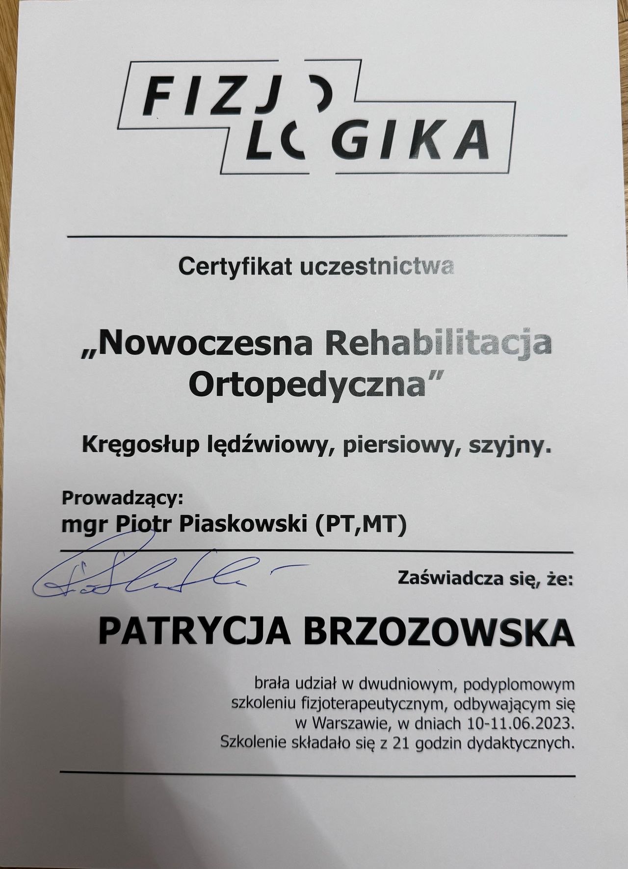 Jaki jest zakres porad oferowanych przez Patrycja Brzozowska?Patrycja Brzozowska to fizjoterapeuta. Na podstawie swojego doświadczenia i wykształcenia Patrycja Brzozowska oferuje usługi takie jak: fizjoterapia, konsultacja fizjoterapeutyczna, wizyta fizjoterapeutyczna, Pinoterapia z terapią manualną, Masaż leczniczy, masaż tkanek głębokich, masaż sportowy, masaż relaksacyjny, masaż limfatyczny, masaż klasyczny.