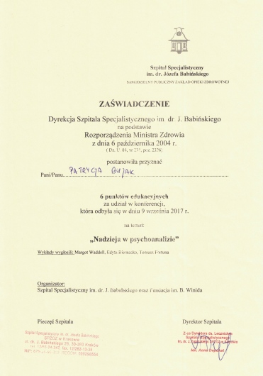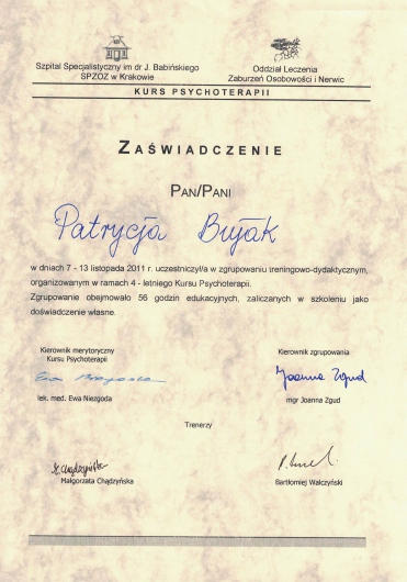 Jaki jest zakres porad oferowanych przez Patrycja Bujak?Patrycja Bujak to psycholog, psychoterapeuta. Na podstawie swojego doświadczenia i wykształcenia Patrycja Bujak oferuje usługi takie jak: psychoterapia indywidualna, konsultacja psychoterapeutyczna (pierwsza wizyta), konsultacja psychoterapeutyczna dla rodzin, konsultacja psychoterapeutyczna.