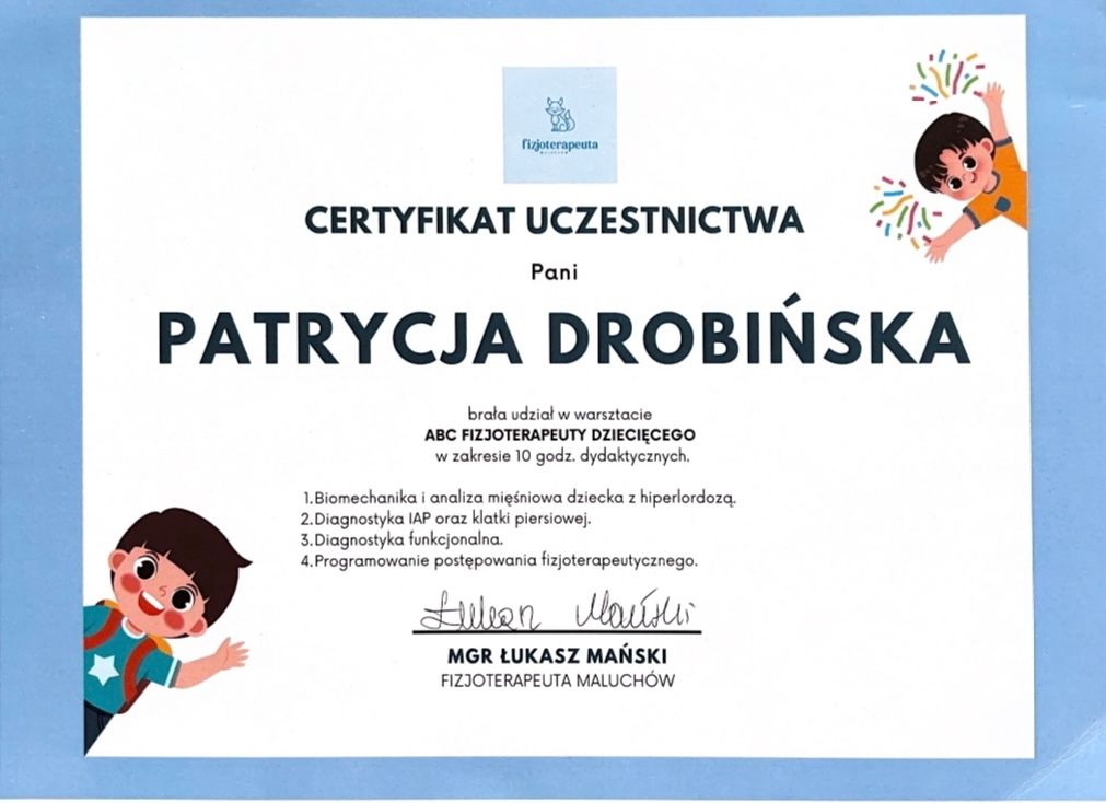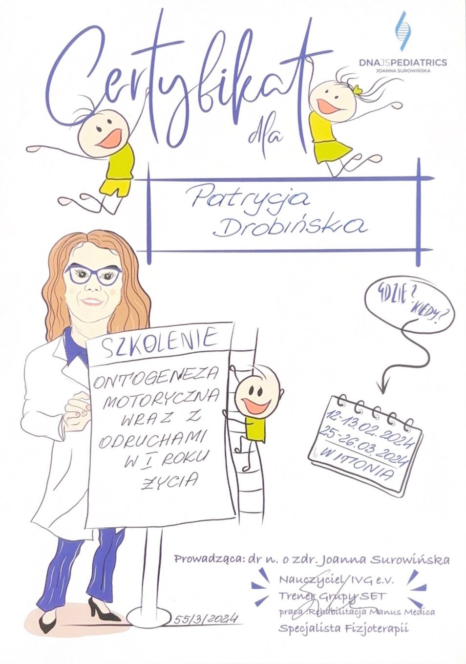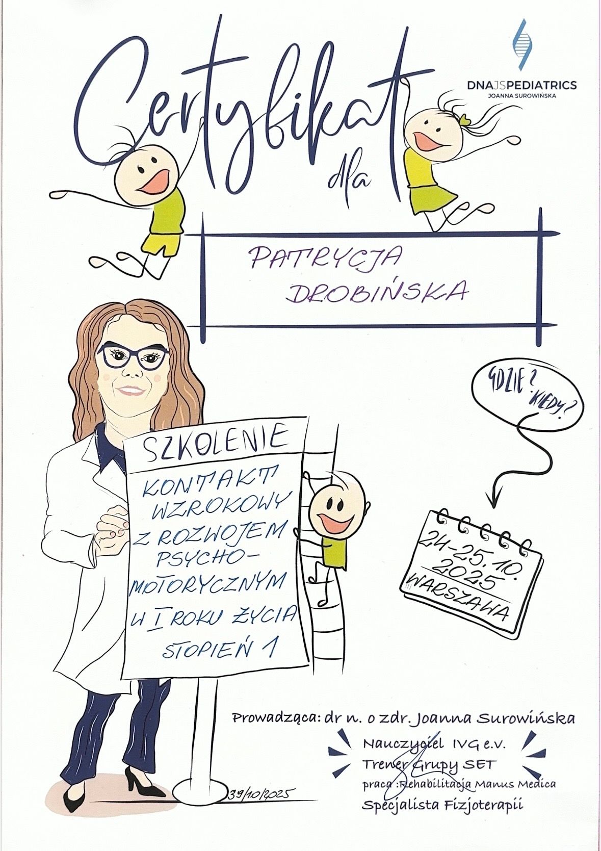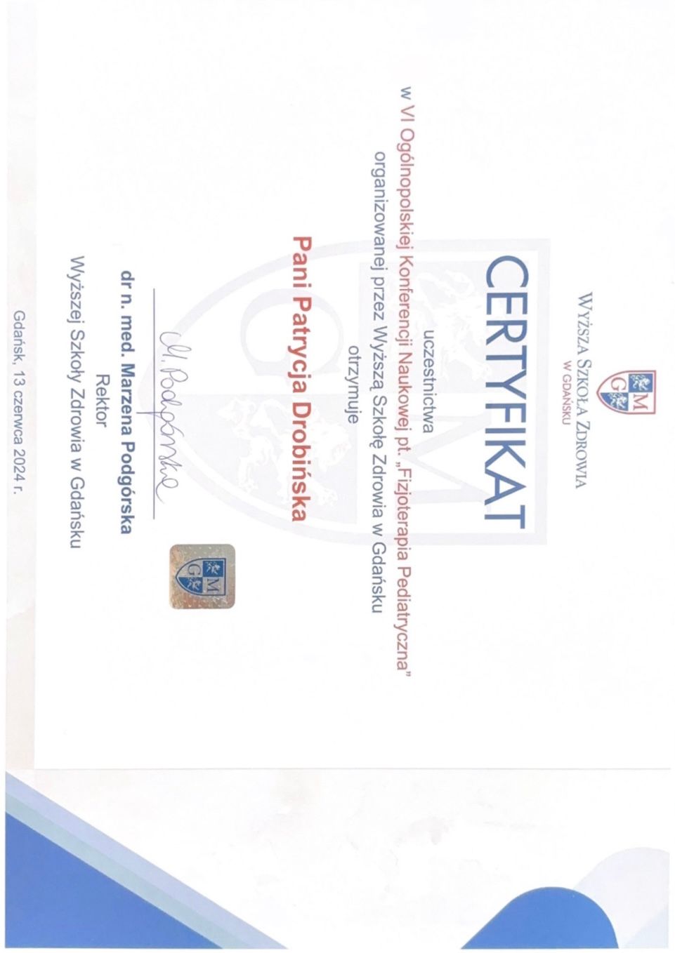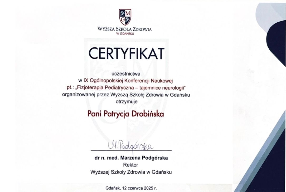 Stale poszerzam swoją wiedzę i umiejętności, biorąc udział w kursach, konferencjach i webinarach, dzięki czemu mogę skutecznie wspierać rozwój moich małych pacjentów, stosując aktualne i sprawdzone rozwiązania terapeutyczne.