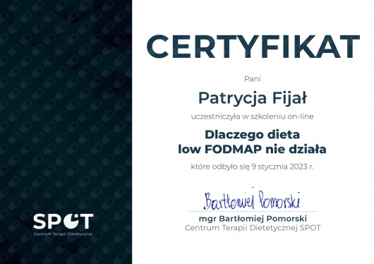 Pani Patrycja to bardzo dobra dietetyk, w pełni zrozumiała moje podejście do diety, czas i dała porady co mogę zmienić, żeby było lepiej - dała konkretne informacje i zaplanowała działania jakie powinienem podjąć. Wyjaśniła wiele rzeczy, które dały mi sporo wiedzy.