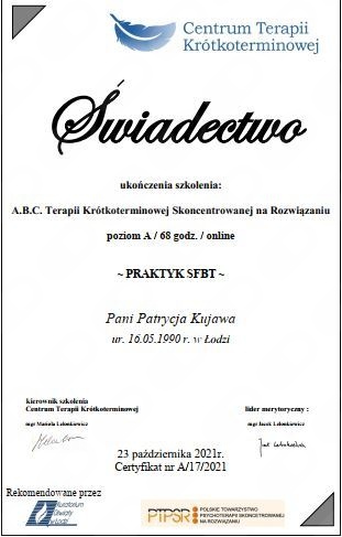 Pierwsze spotkanie wywarło na mnie bardzo pozytywne wrażenie. Pani Patrycja pokazała mi inną perspektywę i sposób rozumienia problemów.