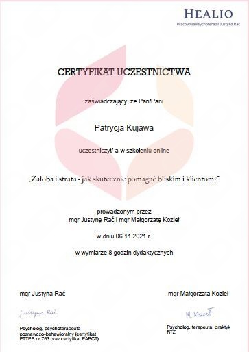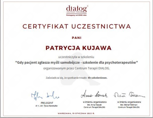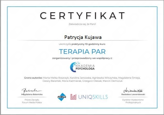 Konsultacje psychologiczne zalecono mi jako uzupełnienie do lekoterapii - i był to strzał w 10! Bardzo polecam terapię u Pani Patrycji. Spotkania były dla mnie ogromnym wsparciem – już w ciągu kilku miesięcy udało mi się uporządkować wiele spraw w głowie, pogodzić się z pewnymi aspektami, zaakceptować siebie, wydobyć siły i by być po prostu bardziej "zintegrowaną". Dzięki terapii czuję się spokojniejsza, bardziej uważna, stabilna i wyrozumiała dla siebie. Czułam się wysłuchana i zaopiekowana, a rozmowy były zawsze w atmosferze zrozumienia i szacunku bez poczucia bycia ocenianą. Jestem bardzo wdzięczna za tę pomoc.
