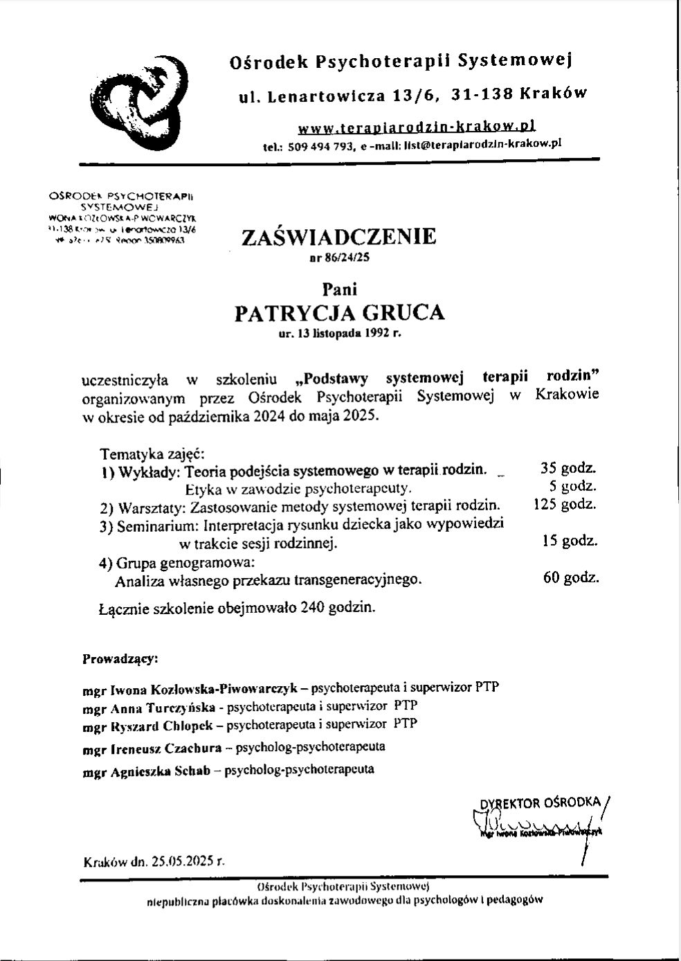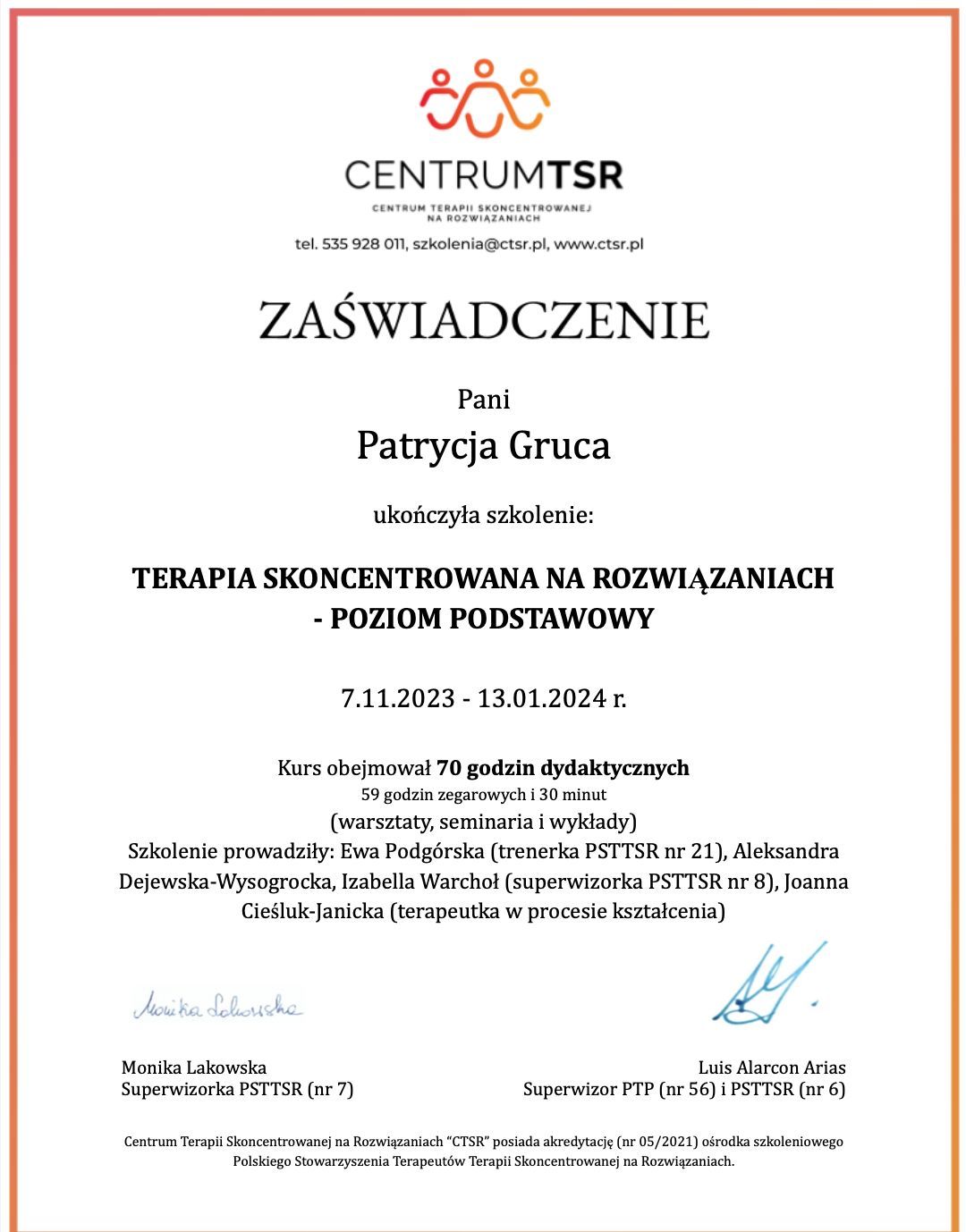 Jestem psycholożką i terapeutką TSR oraz obecnie realizuję 4-letni kurs psychoterapii systemowej. Ukończyłam studia magisterskie na kierunku psychologia kliniczno-sądowa oraz studia podyplomowe z psychologii transportu.