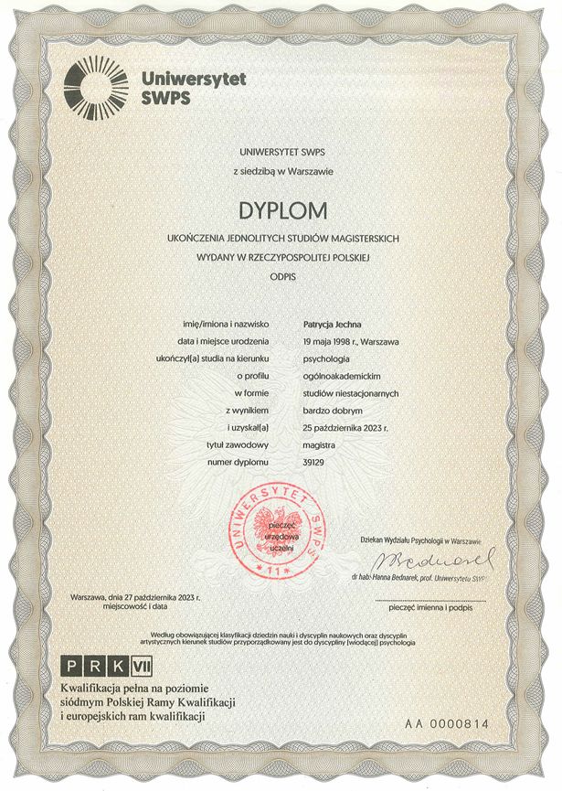 Nazywam się Patrycja Jechna - jestem psycholożką i seksuolożką. Oferuję wsparcie psychologiczne i seksuologiczne stacjonarnie w Warszawie oraz Piasecznie lub online.