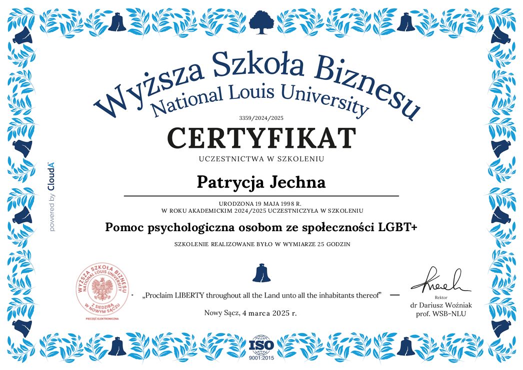 Dbam o jakość mojej pracy, regularnie uczestnicząc w interwizjach oraz mając za sobą własną terapię. Stale dążę do rozwoju i poszerzania swojej wiedzy oraz kompetencji. Biorę udział w szkoleniach, kursach, wydarzeniach oraz konferencjach z zakresu psychologii i seksuologii.