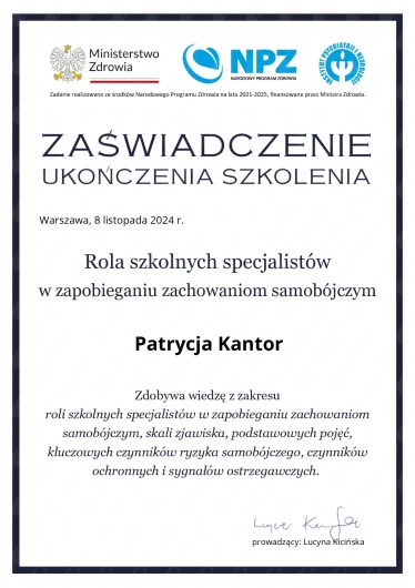 Pani Patrycja pomogła mi zmierzyć się z moimi problemami, wykazując się przy tym olbrzymimi pokładami empatii i cierpliwości.