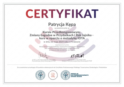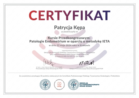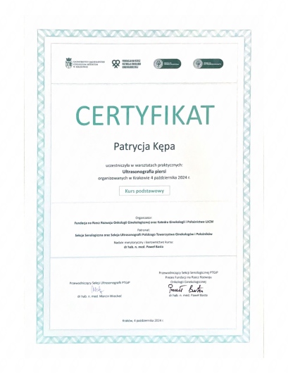 Jaki jest zakres porad oferowanych przez Patrycja Kępa?Patrycja Kępa to w trakcie specjalizacji (ginekolog). Na podstawie swojego doświadczenia i wykształcenia Patrycja Kępa oferuje usługi takie jak: konsultacja ginekologiczna, cytologia, USG płodu, farmakoterapia, Antykoncepcja, badania profilaktyczne, USG jamy brzusznej, prowadzenie ciąży, konsultacja online, USG ginekologiczne.