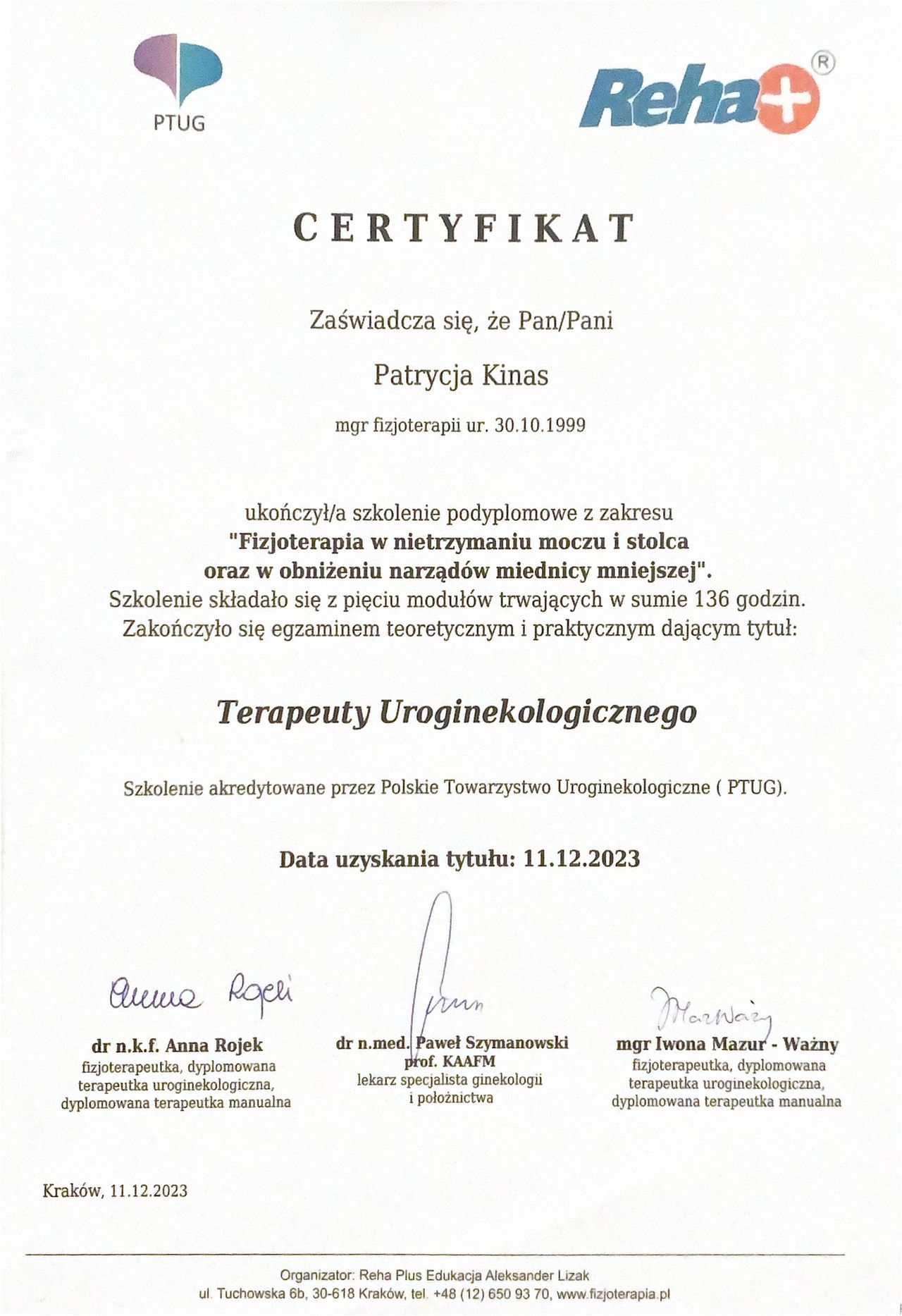 Jestem absolwentką Akademii Wychowania Fizycznego we Wrocławiu, magistrem fizjoterapii oraz certyfikowaną terapeutką uroginekologiczną Polskiego Towarzystwa Uroginekologicznego. Specjalizuję się w diagnostyce funkcjonalnej oraz terapii schorzeń związanych z dnem miednicy, szczególnie w okresie okołoporodowym oraz po operacjach ginekologicznych.