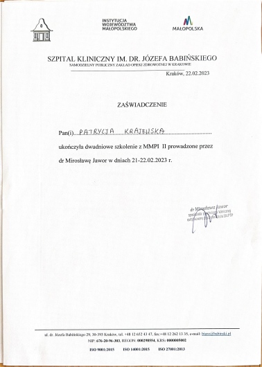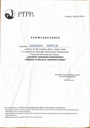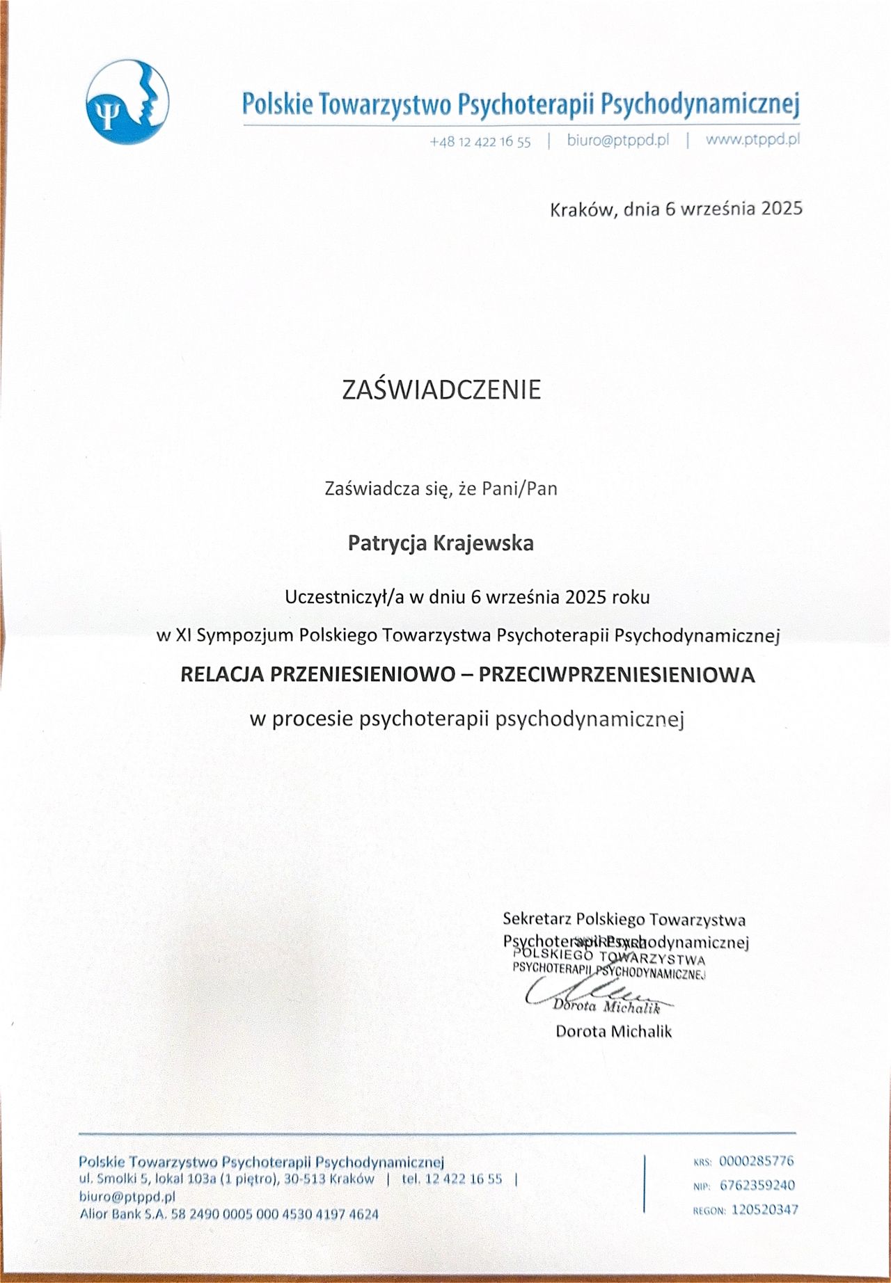 Serdecznie polecam Panią Patrycję Krajewską. To specjalistka, która łączy profesjonalizm z serdecznym, ale konkretnym podejściem. Nie owija w bawełnę, jasno komunikuje swoje spostrzeżenia i daje trafne wskazówki, które naprawdę pomagają. Jest przy tym bardzo miła i empatyczna, ale jednocześnie dba o swoje granice, co buduje poczucie bezpieczeństwa i wzajemnego szacunku. Dzięki Pani Patrycji lepiej rozumiem siebie i wiem, nad czym pracować- mówi wprost, a jednocześnie wspiera.