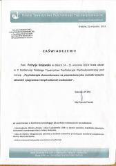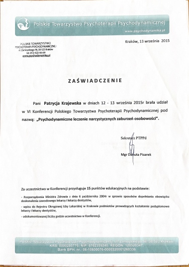 Polecam terapię z Panią Patrycją. Pani Patrycja jest cierpliwa, wyrozumiała, punktualna i bardzo bystra, dostrzega mechanizmy obronne które stosowałam nie zdając sobie z tego sprawy przez wiele lat. Umie stworzyć ciepłą i bezpieczną atmosferę. Zaledwie po kilku spotkaniach z panią Patrycją odczuwam że w końcu pracuję nad swoimi prawdziwymi problemami, zawsze to było błędne koło z którego nie potrafiłam znaleźć wyjścia. Z panią Patrycją już po kilku spotkaniach robię postępy i jestem zadowolona z przebiegu terapii.