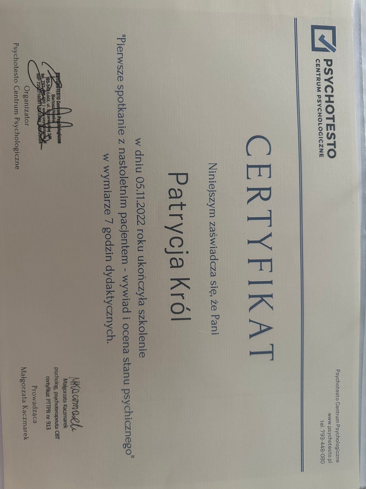 Dbam o regularną superwizję, rozwój mojego warsztatu i pracę zgodną z zasadami etyki zawodu psychologa, aby oferować pomoc na najwyższym poziomie. Tworzę przestrzeń, w której nie trzeba niczego udawać ani „być silnym na siłę”. Wierzę, że autentyczność leczy bardziej niż perfekcja, a każdy z nas nosi w sobie zasoby potrzebne do zmiany. Moją rolą jest pomóc je odnaleźć, w Twoim tempie i z szacunkiem do Twojej drogi.
