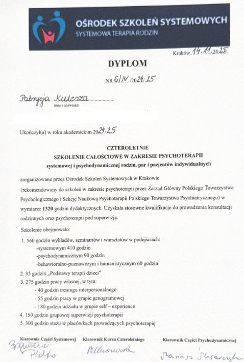 Nazywam się Patrycja Kulesza, jestem psychologiem, seksuologiem oraz dyplomowaną psychoterapeutką w trakcie certyfikacji. Ukończyłam Uniwersytet Jagielloński w Krakowie uzyskując tytuł magistra oraz studia podyplomowe na Uniwersytecie SWPS w zakresie seksuologii klinicznej. Swoją edukację kontynuowałam w ramach rocznego kursu "Terapii par i małżeństw" w Krakowskiej Fundacji Rozwoju Psychoterapii im. Profesor Marii Orwid w Krakowie atestowany przez Sekcję Naukową Psychoterapii i Sekcję Naukową Terapii Rodzin Polskiego Towarzystwa Psychiatrycznego. Dyplom psychoterapeuty uzyskałam poprzez 4 - letni całościowy kurs psychoterapii systemowo - psychodynamicznej w Ośrodku Szkoleń Systemowych w Krakowie rekomendowany przez Polskie Towarzystwo Psychologiczne.