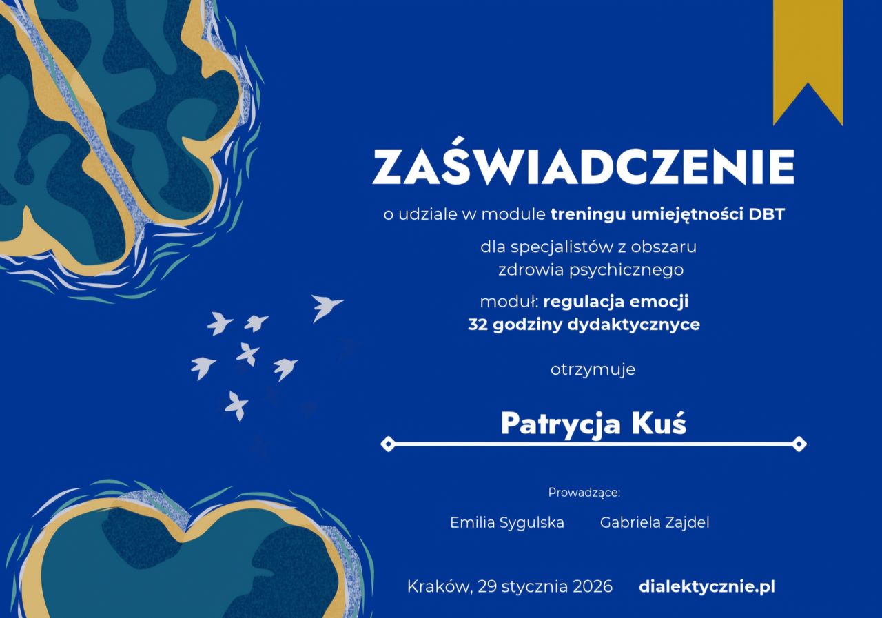 Spotkania z Panią Patrycją przebiegają w spokojnej i bezpiecznej atmosferze. Czułam się wysłuchana i traktowana z uważnością.