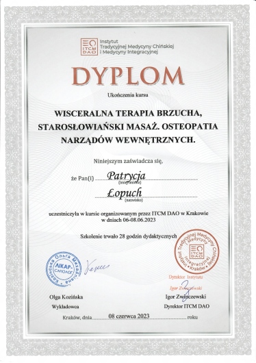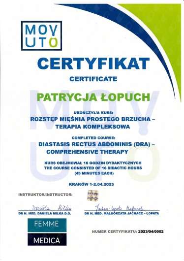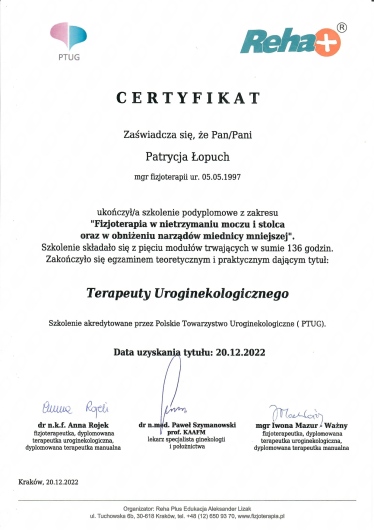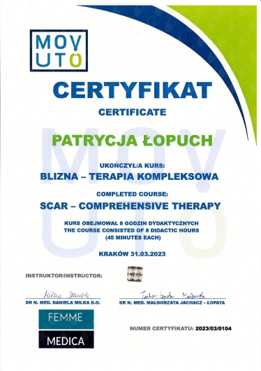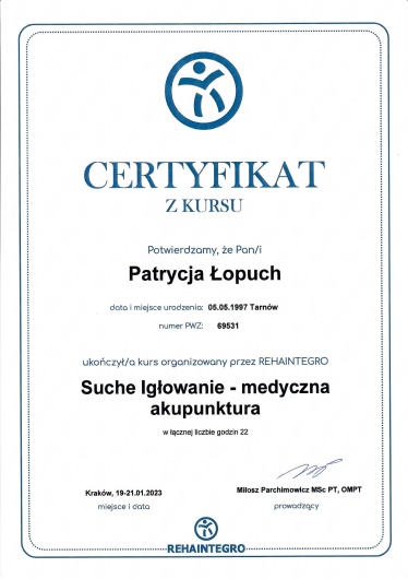 Jaki jest zakres porad oferowanych przez Patrycja Łopuch?Patrycja Łopuch to fizjoterapeuta. Na podstawie swojego doświadczenia i wykształcenia Patrycja Łopuch oferuje usługi takie jak: konsultacja fizjoterapeutyczna, masaż tkanek głębokich, suche igłowanie, terapia blizn, fizjoterapia uroginekologiczna (pierwsza wizyta), fizjoterapia uroginekologiczna (kolejna wizyta), terapia wisceralna dorośli, kinesiotaping, masaż dla kobiet ciężarnych, Trening kobiet w ciąży.