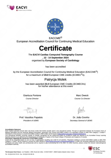 Zdobyłam międzynarodowe doświadczenie zawodowe w trakcie staży w Edynburgu, Machesterze i Greifswaldzie. Aktualnie zajmuję się pracą naukową w dziedzinie kardiologii, ze szczególnym uwzględnieniem multimodalnego obrazowania w kardiologii za pomocą echokardiografii (ECHO serca), tomografii komputerowej serca i rezonansu magnetycznego serca.