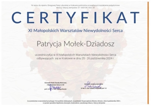 Bardzo polecam konsultacje u Pani doktor Patrycji Mołek - Dziadosz, która w moich oczach rysuje się jako niezwykle zaangażowana, cierpliwa, empatyczna i oddana pacjentowi specjalistka w dziedzinie kardiologii. W trakcie każdej z wizyt mogłam liczyć na szczegółowe wyjaśnienie nurtujących mnie kwestii. Niezwykle cenię fakt, że konsultacje odbywają się bez pośpiechu (co niestety nie w każdej przychodni jest tak oczywiste), w przyjaznej atmosferze, a spokój Pani doktor udziela się nawet najbardziej zestresowanym pacjentom : ) Dziękuję za dotychczasową pomoc!