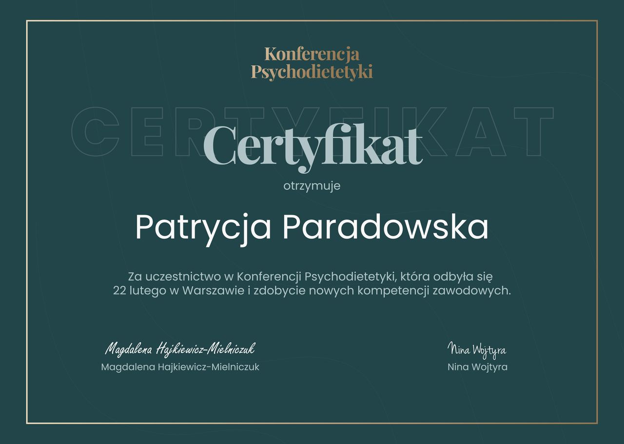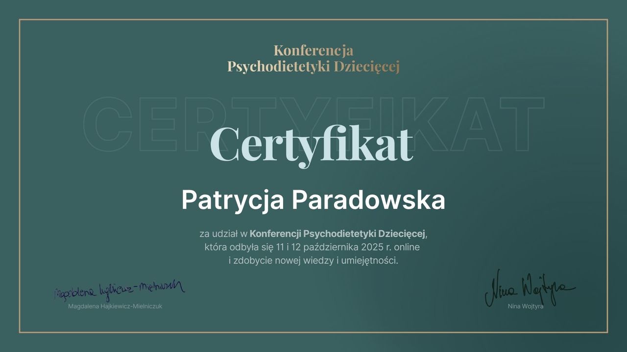 Czy Patrycja Paradowska przyjmuje online, bez konieczności pojawiania się w placówce?Tak, Patrycja Paradowska oferuje konsultacje online. Wybierz opcję „konsultacja online” przy umawianiu wizyty, a zobaczysz dostępne terminy.