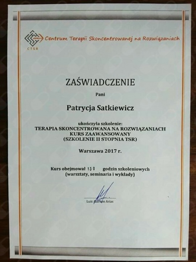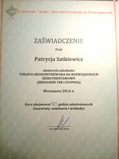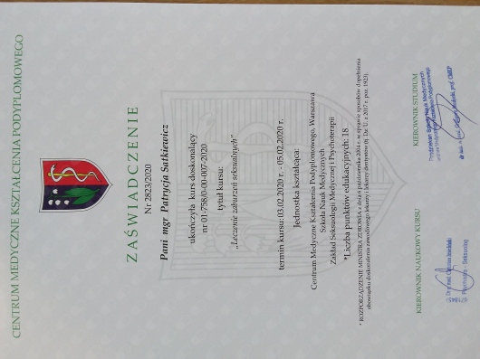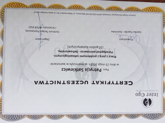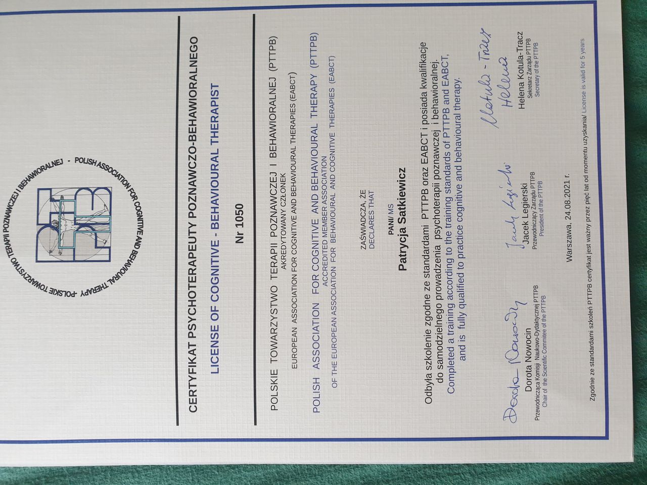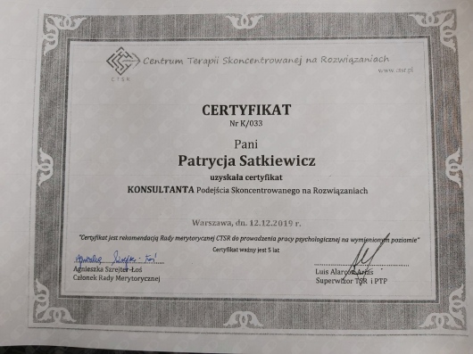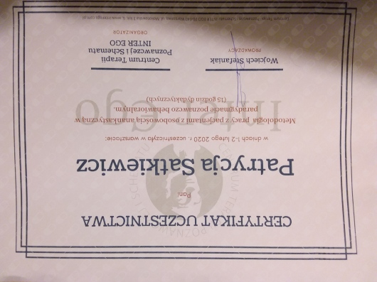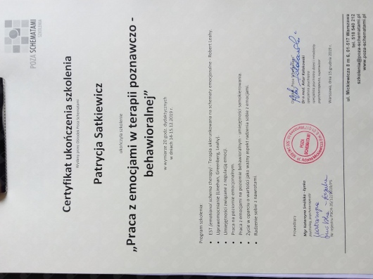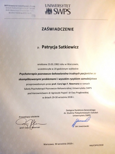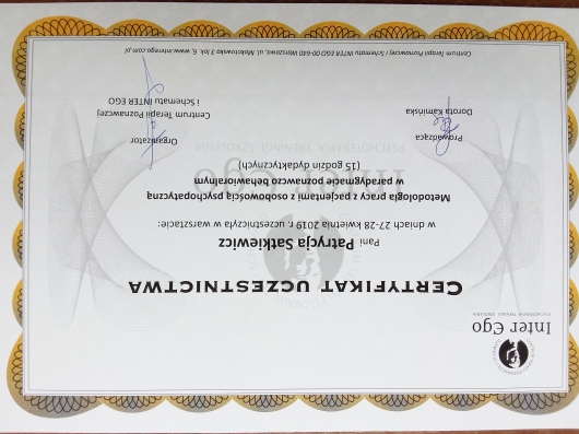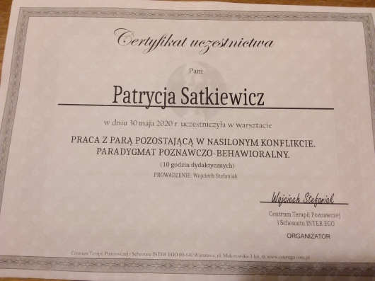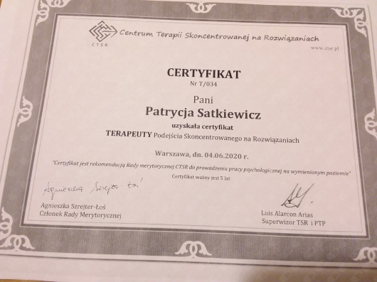 Pozostaje pod stałą superwizją. Przeszłam własną terapie szkoleniową. Posiadam aktualne ubezpieczenie OC zawodu. Nie jestem lekarzem, a więc nie wypisuje recept i zwolnień. Należę do Polskiego Towarzystwa Terapii Poznawczej i Behawioralnej.