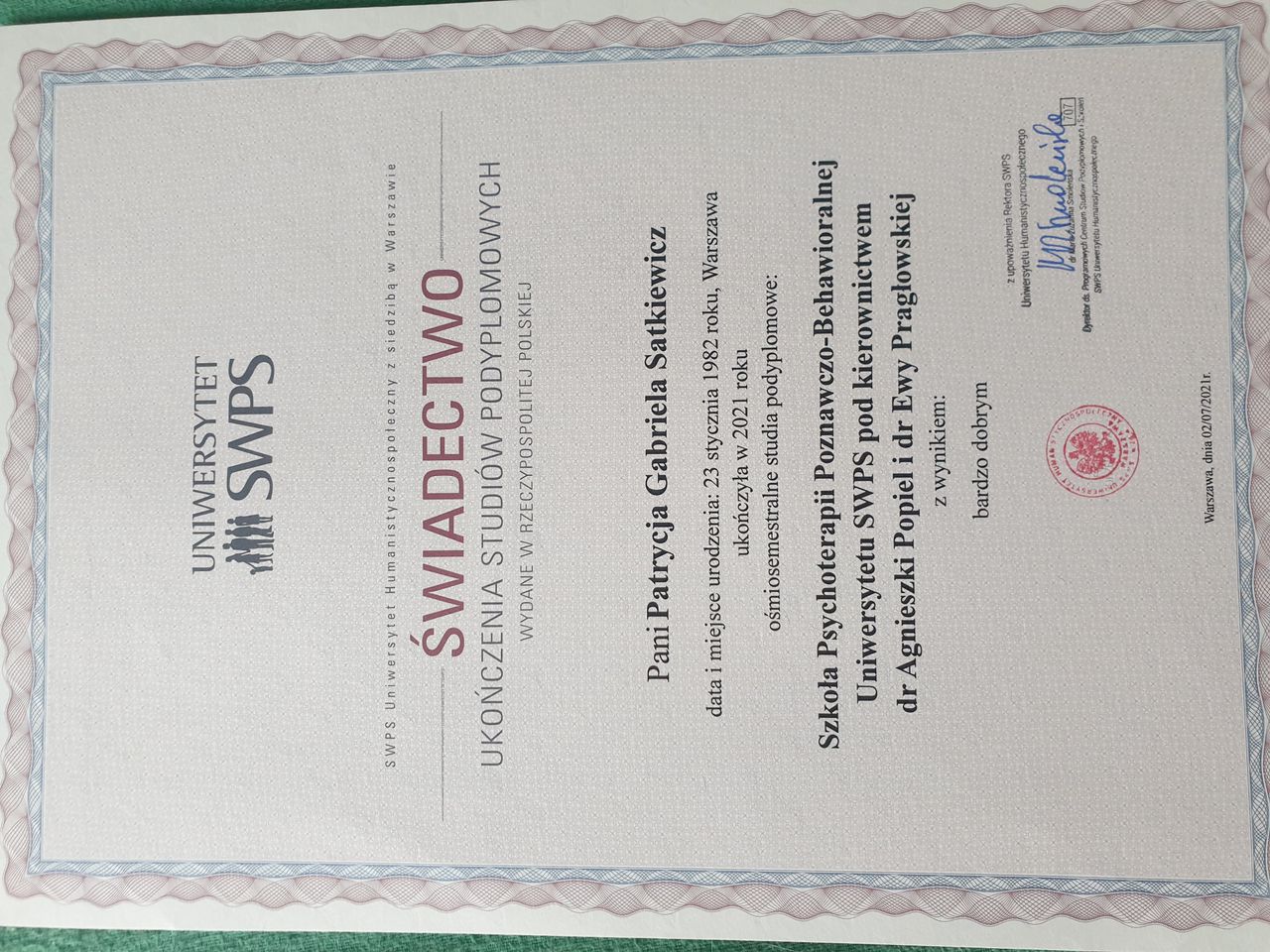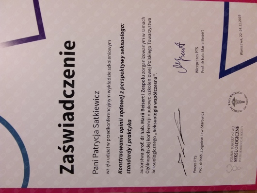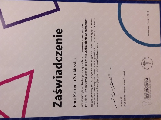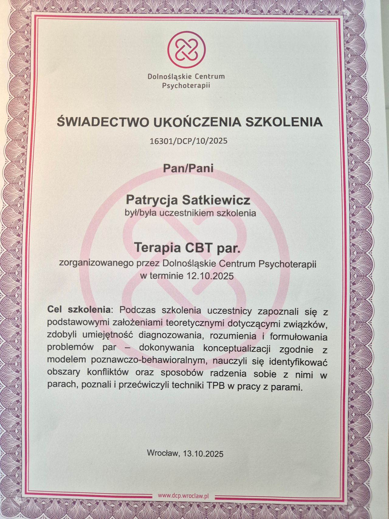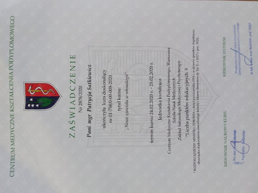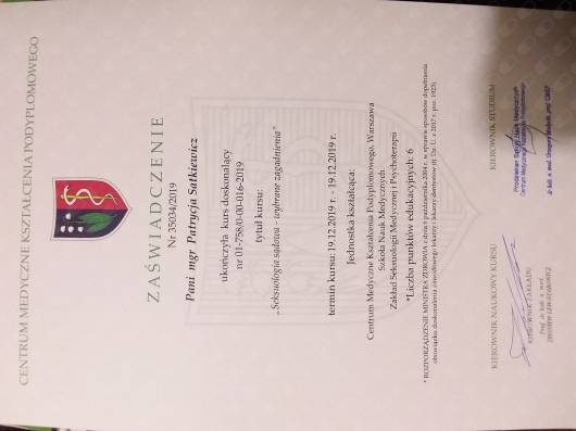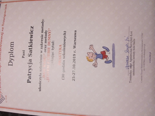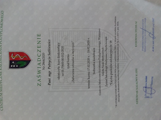 Pozostaje pod stałą superwizją. Przeszłam własną terapie szkoleniową. Posiadam aktualne ubezpieczenie OC zawodu. Nie jestem lekarzem, a więc nie wypisuje recept i zwolnień. Należę do Polskiego Towarzystwa Terapii Poznawczej i Behawioralnej.