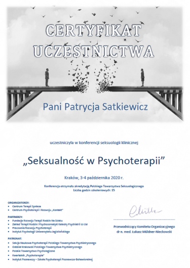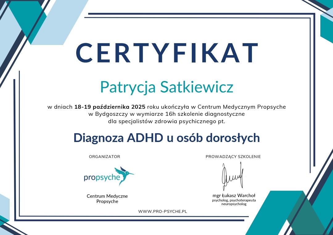 Dziś śpię spokojnie i bez lęku patrzę w przyszłość. Jestem ogromnie wdzięczny za cierpliwość, zaangażowanie i skuteczną pomoc. Z całego serca polecam terapię u Pani Psycholog Patrycji Satkiewicz każdemu, kto potrzebuje wsparcia – naprawdę warto!• Gabinet Psychoterapii i Terapii Seksuologicznej • psychoterapia indywidualna •