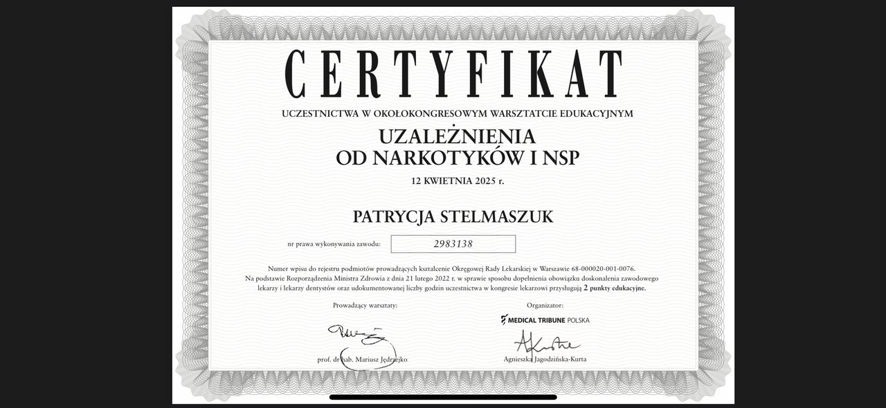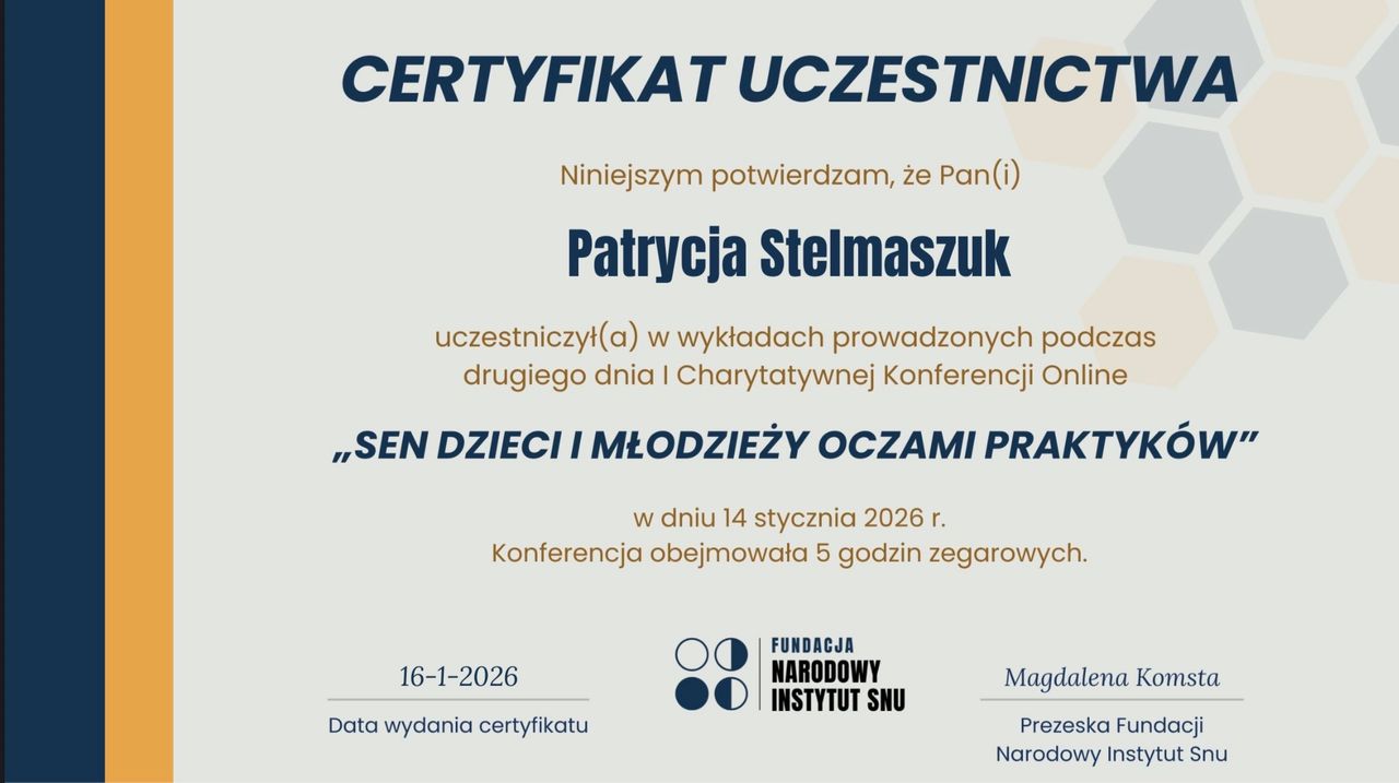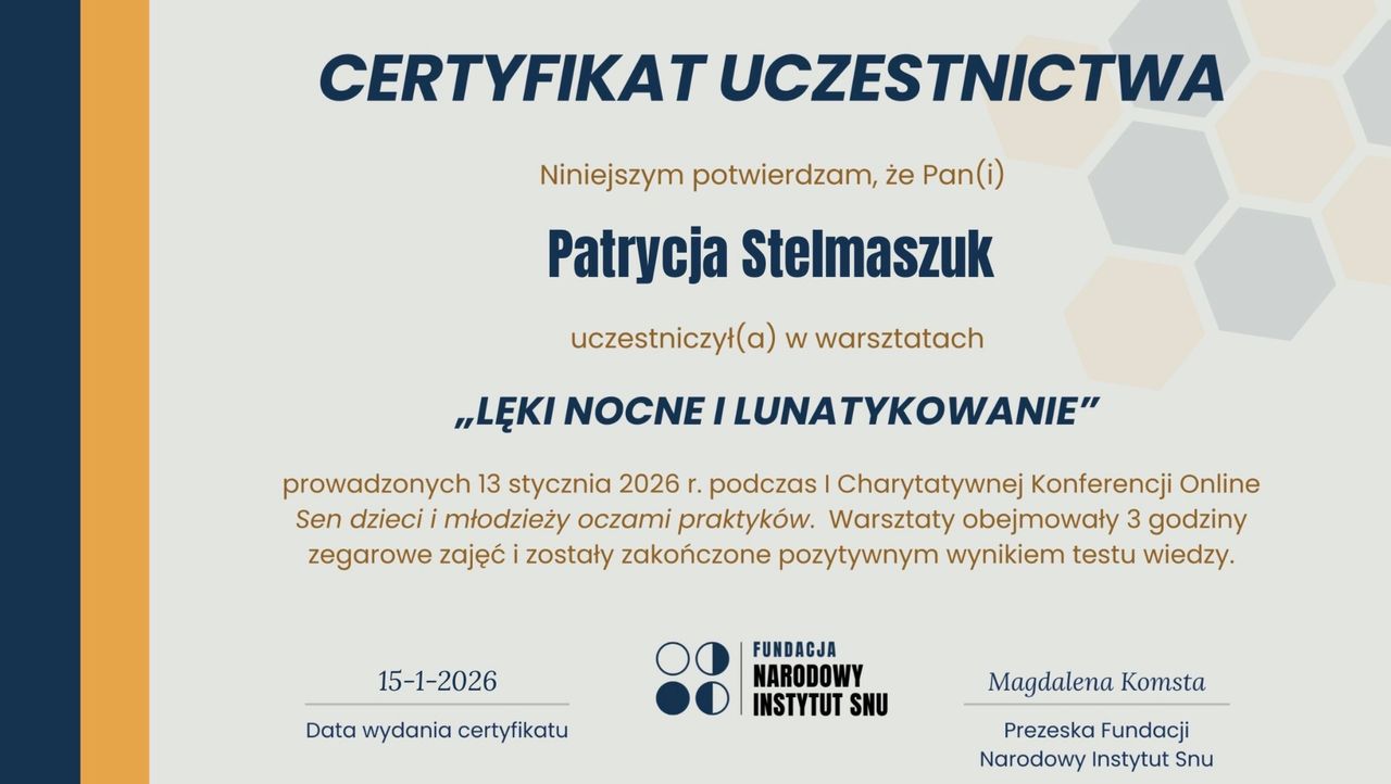 Czy Patrycja Stelmaszuk przyjmuje online, bez konieczności pojawiania się w placówce?Tak, Patrycja Stelmaszuk oferuje konsultacje online. Wybierz opcję „konsultacja online” przy umawianiu wizyty, a zobaczysz dostępne terminy.