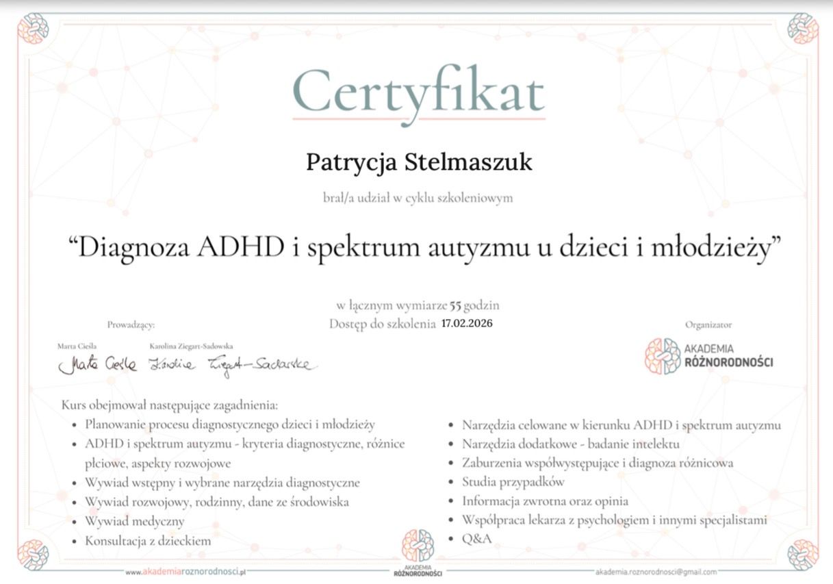 Moim szczególnym obszarem zainteresowań jest ADHD. Ukończyłam 1,5 roczny kurs „Psychiatria dzieci i młodzieży - wybrane zagadnienia kliniczne” w Klinice Psychiatrii Dzieci i Młodzieży Uniwersytetu Medycznego w Poznaniu oraz szkolenie dla specjalistów „Diagnoza ADHD i spektrum autyzmu dzieci i młodzieży” organizowane przez Akademię Różnorodności.