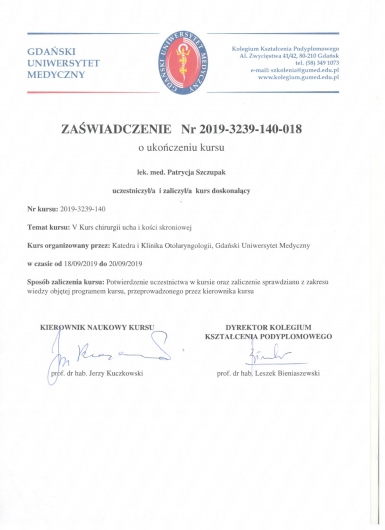 Dyplom lekarza uzyskany na II Wydziale Lekarskim Warszawskiego Uniwersytetu Medycznego.