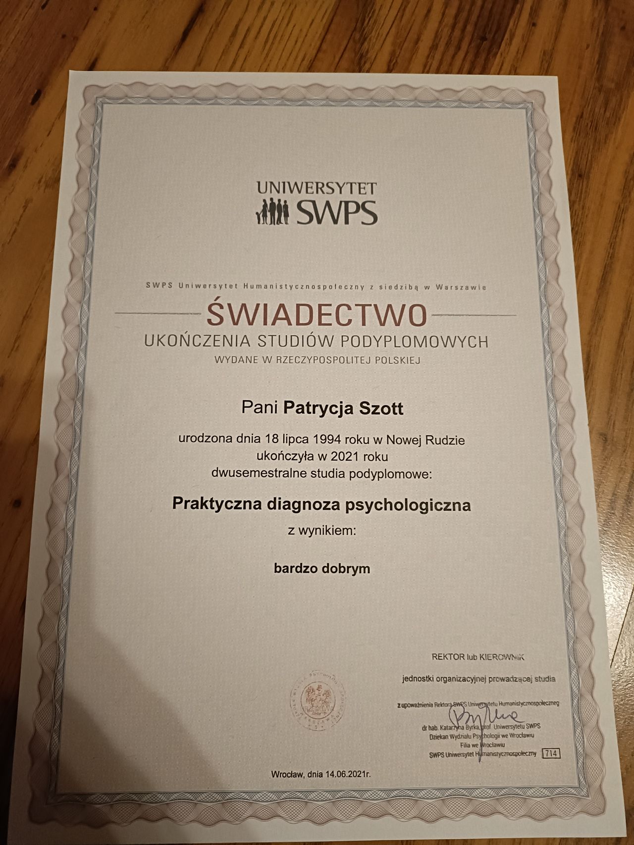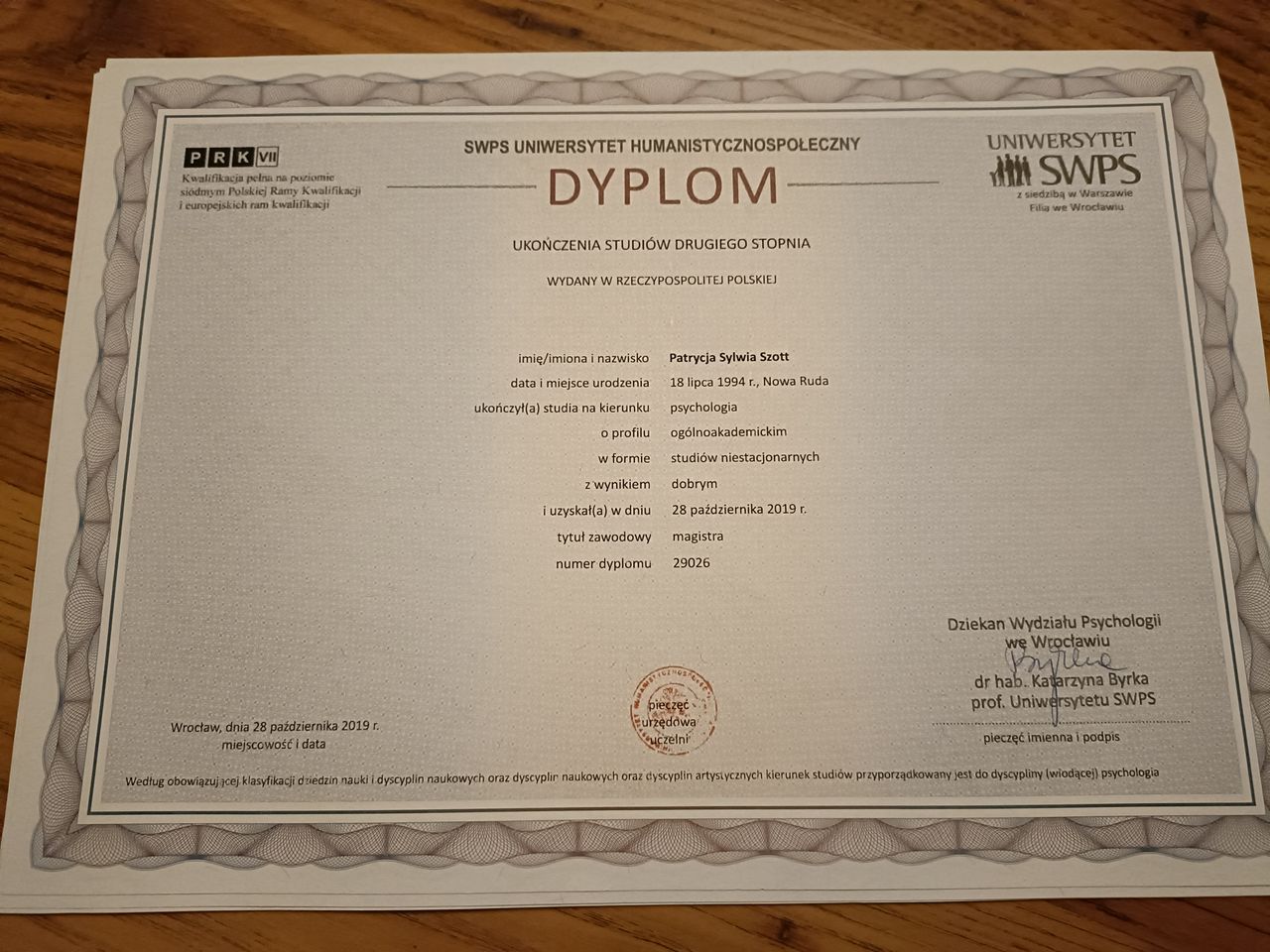 Ukończyłam pięcioletnie studia magisterskie z Psychologii ( specjalność kliniczna ) na Uniwersytecie SWPS. Jestem absolwentką studiów podyplomowych z Diagnozy psychologicznej w praktyce klinicznej. Obecnie jestem w trakcie kształcenia studiów podyplomowych z seksuologii klinicznej na Uniwersytecie SWPS we Wrocławiu oraz studiów podyplomowych z psychotraumatologii na Uniewrsytecie Dolnośląskim DSW. Doświadczenie zdobywałam podczas praktyk i stażu w poradniach psychologicznych, ośrodkach wychowawczych, szkołach a także jako interwent kryzysowy. Następnie zdobywałam wiedzę i doświadczenie w jednostkach mundurowych takich jak wojsko oraz zakład karny. Prowadzę konsultacje oraz diagnostykę psychologiczną. Pracuję z młodzieżą od 14 r.ż i osobami dorosłymi. Zajmuję się osobami, które są w kryzysie psychologicznym, osobami z niską samooceną, zmagającymi się z trudnościami emocjonalnymi a także zaburzeniami nastroju. Udzielam psychoedukacji oraz wsparcia osobom zmagającymi się z problemami sfery seksuologicznej. Prowadzę diagnozę psychologiczną dla osób z zaburzeniami koncentracji uwagi, nadaktywności psychoruchowej i nadmiernej impulsywności (ADD, ADHD), zaburzeń osobowości (badanie osobowości MMPI-2) oraz innych problemów natury psychologicznej. Udzielam również porad oraz wsparcia osobom zmagającymi się z problemami sfery seksuologicznej ( przedwczesny wytrysk, ból podczas stosunku, brak orgazmu, obniżone libido).