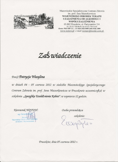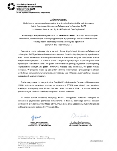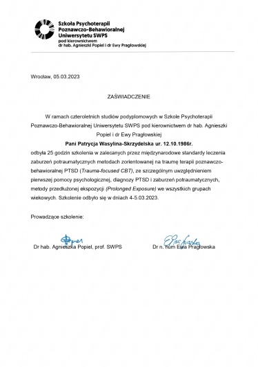 Swoją pracę zawodową regularnie poddaje superwizji indywidualnej i grupowej prowadzonej przez superwizorów Polskiego Towarzystwa Terapii Poznawczej i Behawioralnej.