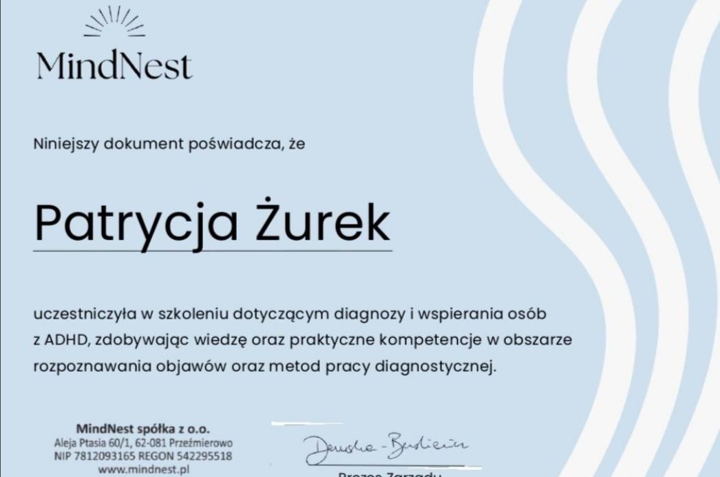 Specjalizuję się w diagnostyce i wsparciu osób z ADHD (standard DIVA-5). Szczególną uwagę poświęcam zjawisku maskowania, które często dotyczy kobiet, pomagając im zrozumieć ich sposób funkcjonowania i zdjąć ciężar narzuconych oczekiwań społecznych.
