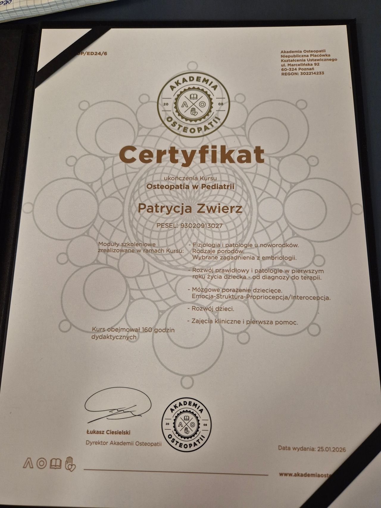 Nazywam się Patrycja Zwierz, w 2018r. obroniłam tytuł magistra fizjoterapii na Uniwersytecie Medycznym im. Piastów Śląskich we Wrocławiu i w tym samym roku podjęłam 4-letnie studia z Medycyny Osteopatycznej na Akademii Osteopatii w Warszawie. A następnie w ukończyłam Osteopatię Pediatryczną na Akademii Osteopatii w Poznaniu. To była długa, ale cenna droga, która pozwoliła mi zrozumieć jak funkcjonuje ludzki organizm.