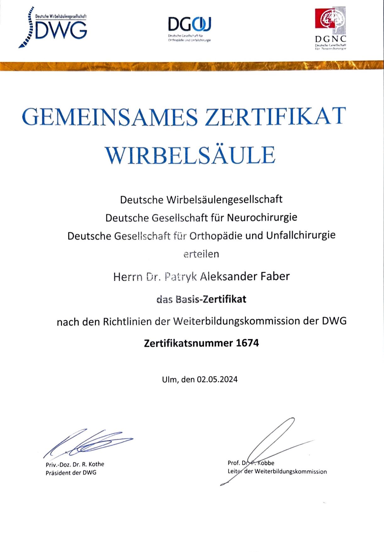 Certyfikat DWG: Posiadam Certyfikat Niemieckiego Towarzystwa Chirurgii Kręgosłupa (DWG), którego uzyskanie wiązało się ze spełnieniem niezwykle rygorystycznych wymogów operacyjnych i zdaniem wymagających egzaminów teoretycznych.