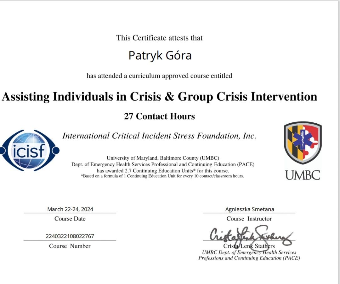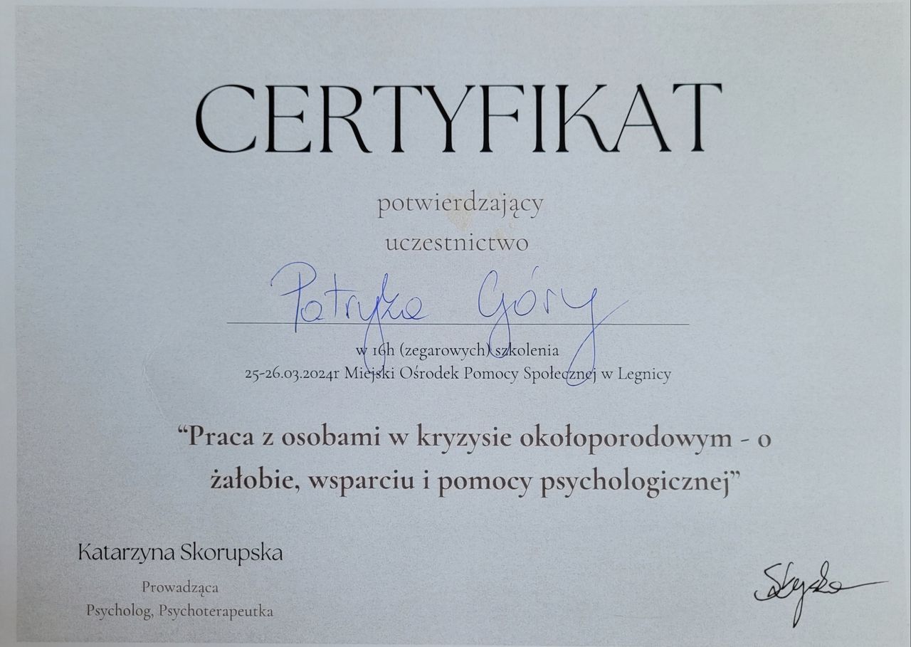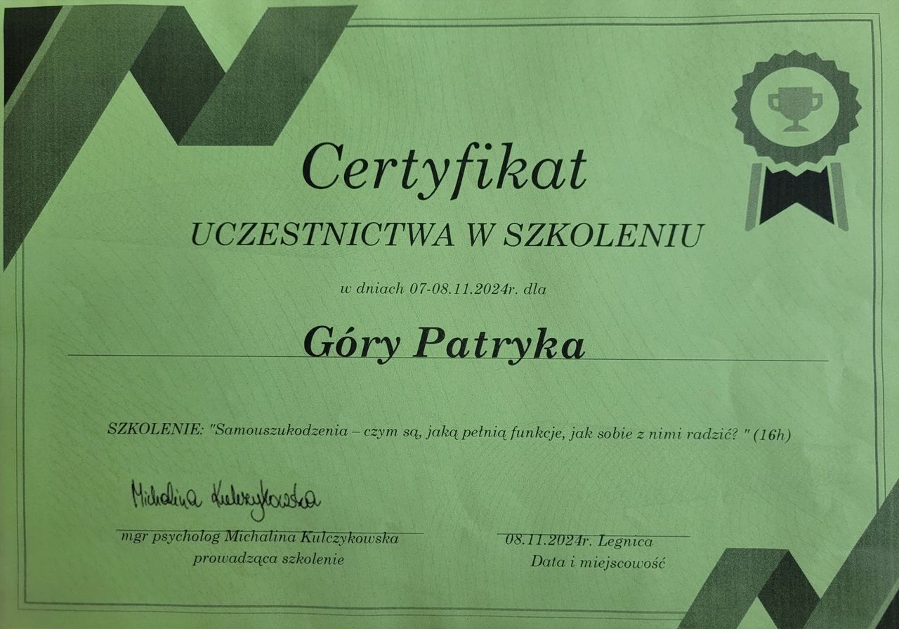 Nieustannie rozwijam swój warsztat i umiejętności uczestnicząc w kursach i szkoleniach, m.in z zakresu samouszkodzeń i interwencji w sytuacji doświadczania kryzysów życiowych. Rozwój jest dla mnie fundamentem pracy w zawodzie psychologa oraz psychoterapeuty.