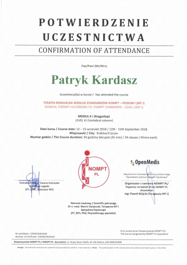 2018 - Terapia Manualna wg Standardów IFOMPT (MT I)„Moduł KI (kręgosłup) (OpenMedis)
