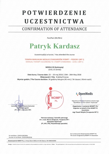 2018 - Terapia Manualna wg Standardów IFOMPT (MT I)„Moduł KII (kręgosłup) (OpenMedis)