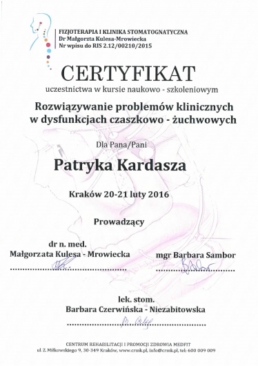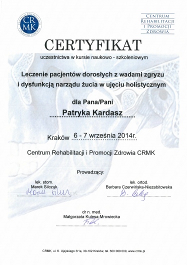 2014 - Leczenie pacjentów dorosłych z wadami zgryzu i dysfunkcją narządu żucia w ujęciu holistycznym (Centrum Rehabilitacji i Promocji Zdrowia)
