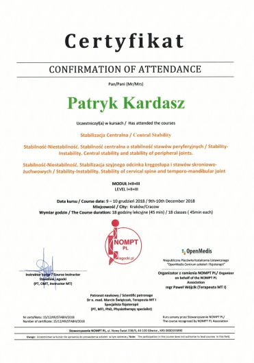 2018 - Kurs stabilizacji - Moduł II: Stabilność-niestabilność. Stabilność Centralna a stabilność stawów peryferyjnych. (OpenMedis)