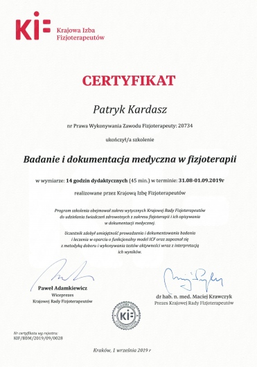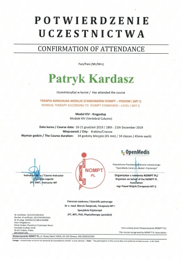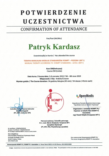2019 - Terapia Manualna wg Standardów IFOMPT (MT I)„Moduł KIV (kończyny)” (OpenMedis)