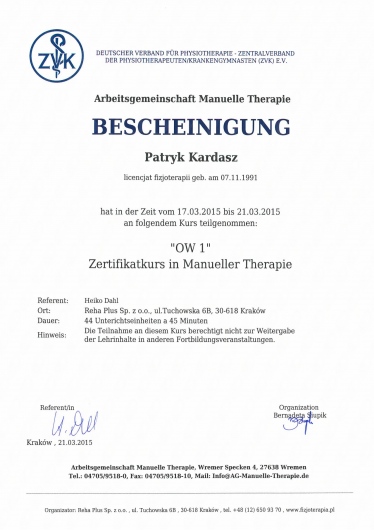 2015 - Kurs Terapii Manualnej Szkoły Niemieckiej.Moduł (OW1): „Podstawy terapii manualnej: środkowy odcinek szyjny, bark” (Rehaplus)