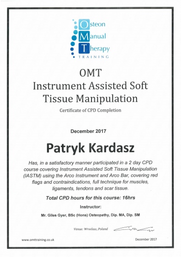 Już od studiów jednym z moich dominujących zawodowych zainteresowań jest tematyka stawów skroniowo-żuchwowych, ich mechanika, korelacja z resztą ciała a także mnogość zaburzeń, która współcześnie im towarzyszy. Swoją wiedzę w tym zakresie pogłębiam zarówno u polskich jak i zagranicznych instruktorów. Obecnie jestem uczestnikiem miedzynarodowego szkolenia, które uznawane jest w środowisku za najbardziej kompleksowe podejście w tej dziedzinie tzn. CRAFTA (Cranial Facial Therapy Academy - Akademia Terapii Czaszkowo-Twarzowej) Dodatkowo interesuje się także terapią blizn.