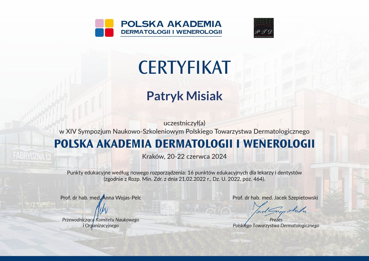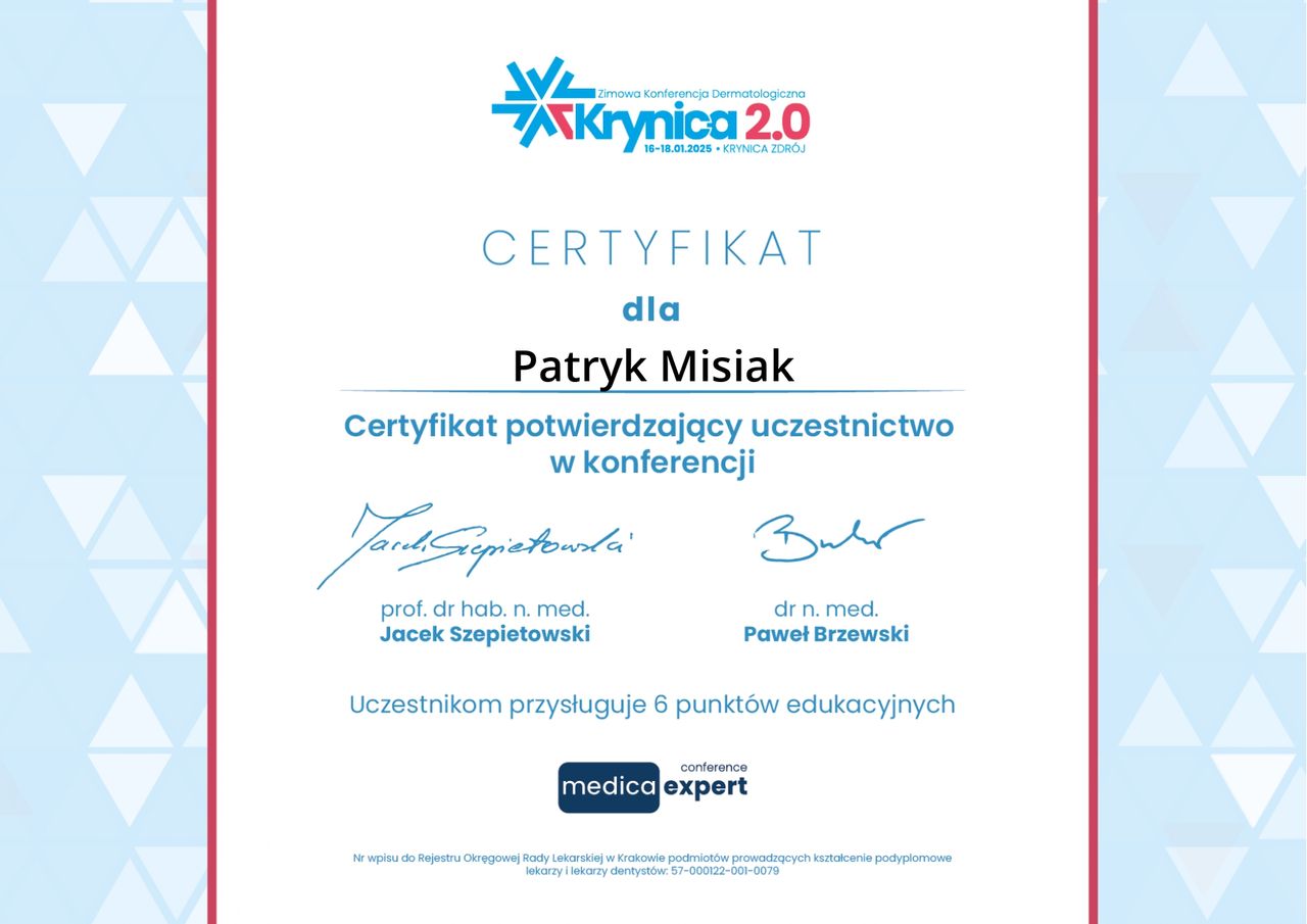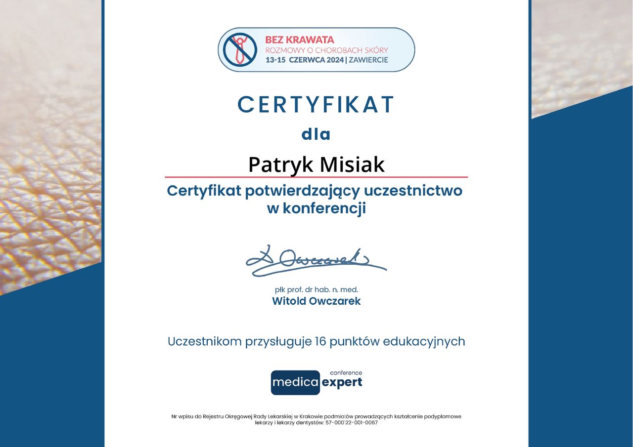 Nazywam się Patryk Misiak i jestem lekarzem w trakcie specjalizacji z dermatologii i wenerologii. Ukończyłem Uniwersytet Jagielloński Collegium Medicum w 2020 roku, a swoją wiedzę i doświadczenie zdobywałem zarówno w Polsce, jak i za granicą. Podczas studiów odbywałem praktyki w Bułgarii, Indonezji oraz Maroku, co pozwoliło mi poznać różnorodne przypadki kliniczne oraz podejścia do diagnozowania i leczenia pacjentów.