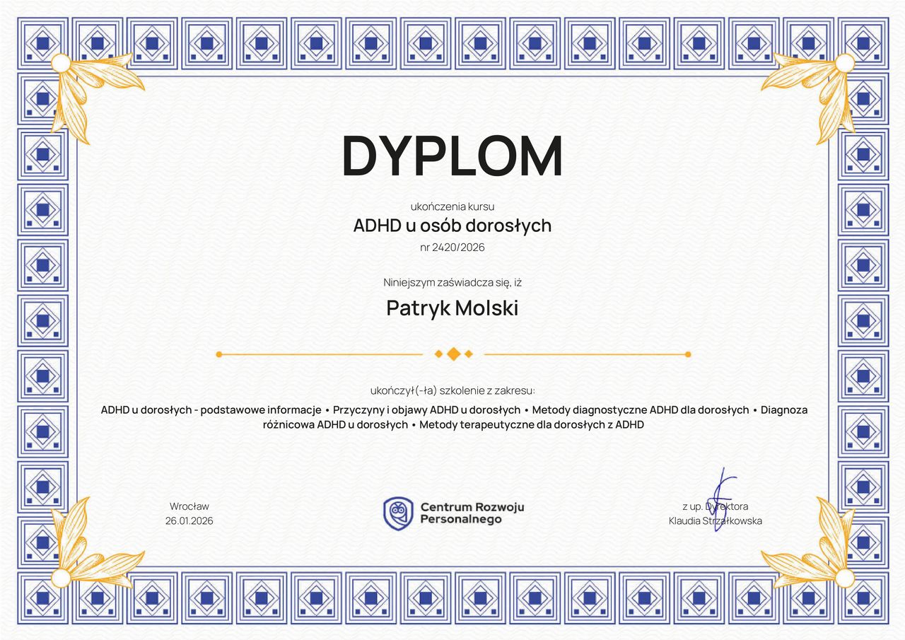 Czy Patryk Molski przyjmuje online, bez konieczności pojawiania się w placówce?Tak, Patryk Molski oferuje konsultacje online. Wybierz opcję „konsultacja online” przy umawianiu wizyty, a zobaczysz dostępne terminy.