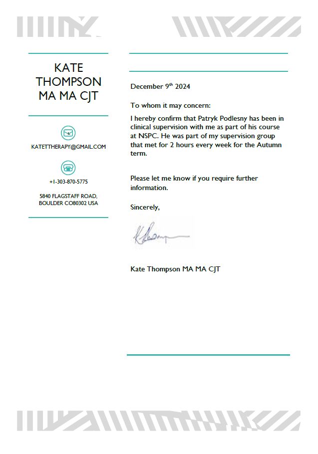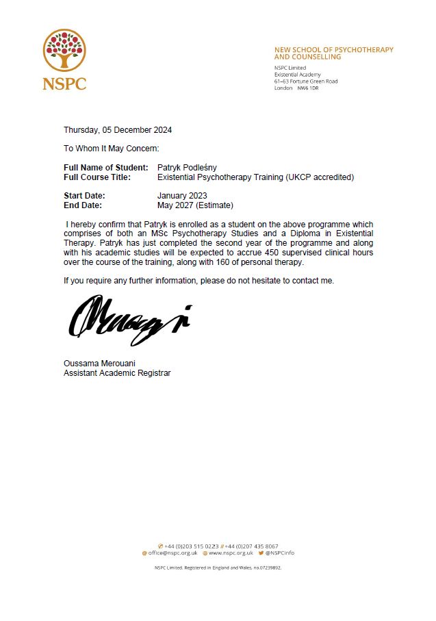 Jestem doktorantem w Instytucie Psychologii Uniwersytetu Jagiellońskiego i psychoterapeutą w trakcie doskonalenia zawodowego w Middlesex University w Londynie. Specjalizuję się w podejściu egzystencjalnym, które skupia się na eksploracji głębszych znaczeń życia i cierpienia, aby umożliwić ci pełniejsze życie i z wyraźniejszym celem. Do metod pracy podchodzę w sposób integratywny, co oznacza że wykorzystuję elementy psychoterapii psychodynamicznej i poznawczo-behawioralnej. Zakładam, że każda osoba jest wyjątkowa i dlatego swoje podejście dostosowuję do potrzeb klienta.