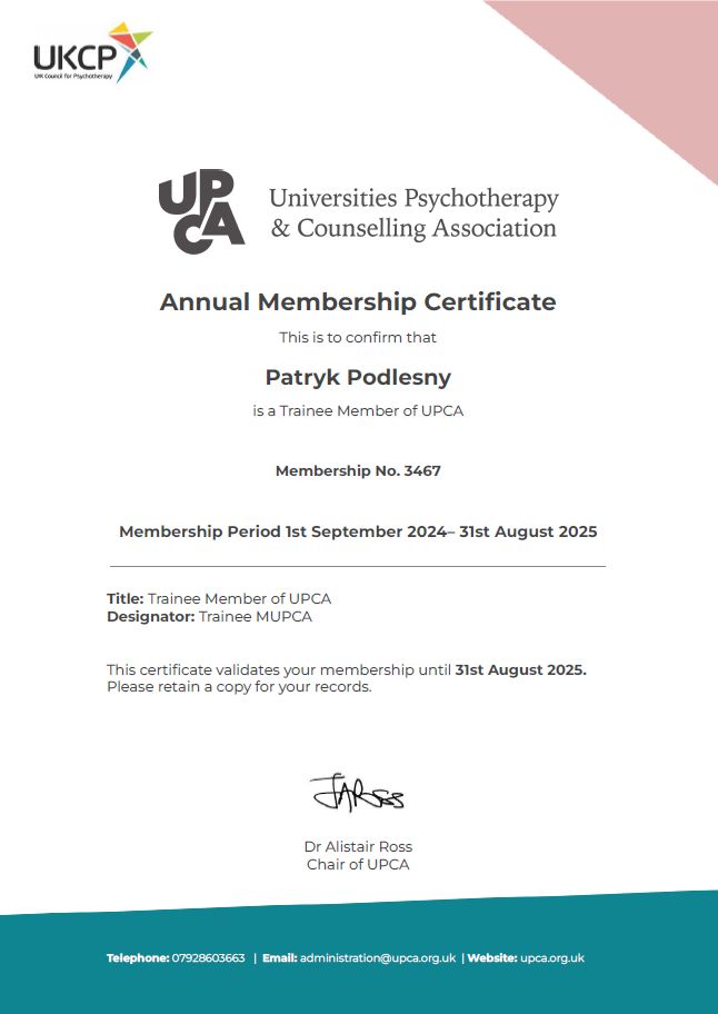Moim celem jest wyjaśnienie tych aspektów twojego życia, które powodują cierpienie, zamęt lub złość i które mogą prowadzić do uczucia utknięcia, blokady, niespełnienia i rozpaczy. Jestem członkiem brytyjskiego stowarzyszenia UPCA (Universities Psychotherapy and Counselling Association).