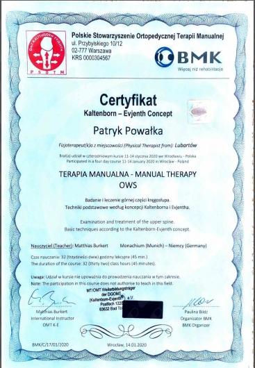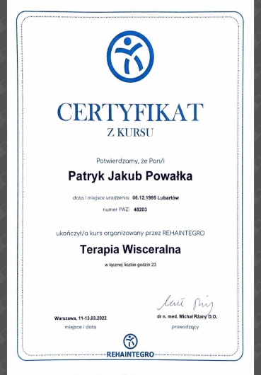 Jaki jest zakres porad oferowanych przez Patryk Powałka?Patryk Powałka to fizjoterapeuta. Na podstawie swojego doświadczenia i wykształcenia Patryk Powałka oferuje usługi takie jak: konsultacja fizjoterapeutyczna, osteopatia, terapia wisceralna, Terapia czaszkowo-krzyżowa, leczenie zawrotów głowy i zaburzeń równowagi, Zabiegi medycyny osteopatycznej, chiropraktyka, Drenaż limfatyczny, fizjoterapia, kinezyterapia.