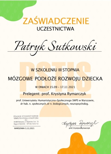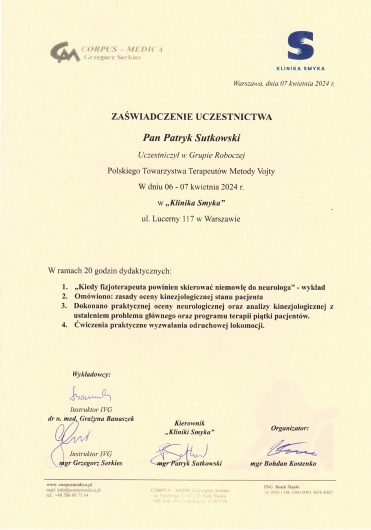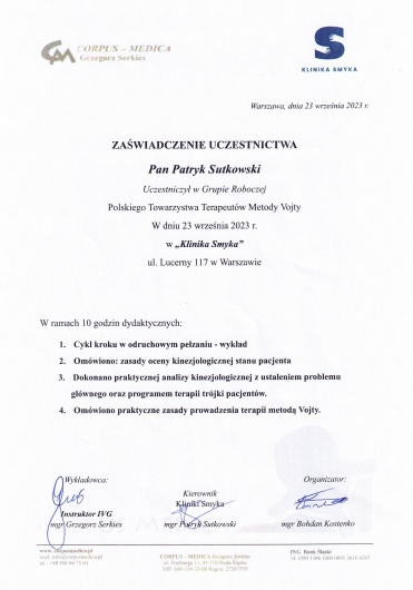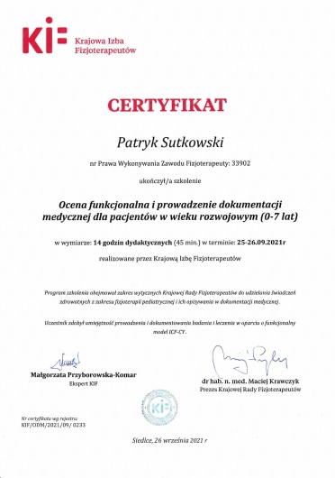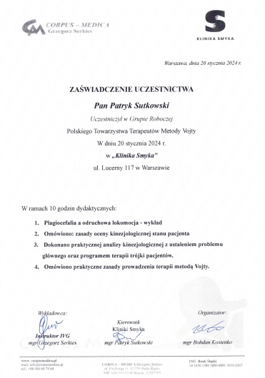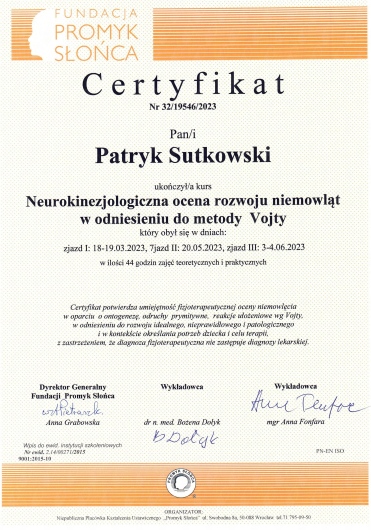 Moja praktyka opiera się na solidnej wiedzy zdobytej podczas wielu kursów i szkoleń w dziedzinie fizjoterapii dziecięcej. Uzyskałem dyplom na Akademii Wychowania Fizycznego we Wrocławiu – Wydział Fizjoterapii, kolejno ukończyłem studia podyplomowe w Poznaniu - Fizjoterapia w Pediatrii. Kluczową wiedze uzyskałem broniąc tytuł Certyfikowanego terapeuty metody Vojty. Jestem przekonany, że nauka i rozwijanie swoich umiejętności to klucz do skutecznej pracy. Dlatego stale poszerzam swoją wiedzę, aby być na bieżąco z najnowszymi metodami i technikami rehabilitacji dzieci. Dzielenie się wiedzą sprawia mi dużą satysfakcję, dlatego realizuję się również jako wykładowca Akademicki na Akademii Wychowania Fizycznego w Warszawie. Prowadzę ćwiczenia i wykłady dla studentów fizjoterapii w ramach przedmiotu - planowanie rehabilitacji w wieku rozwojowym.
