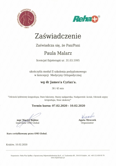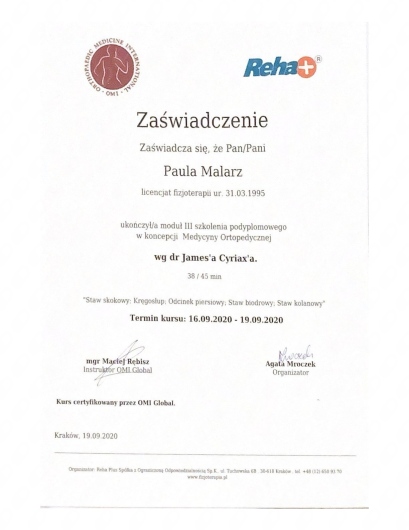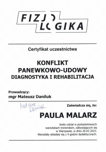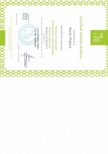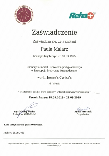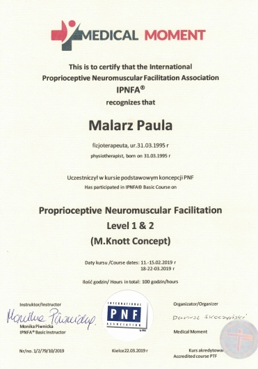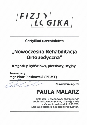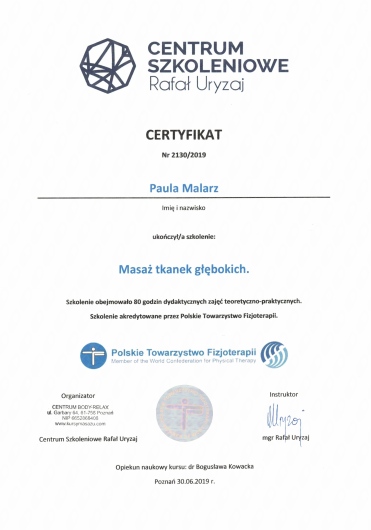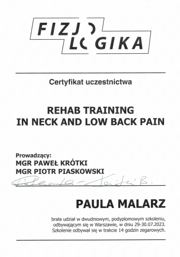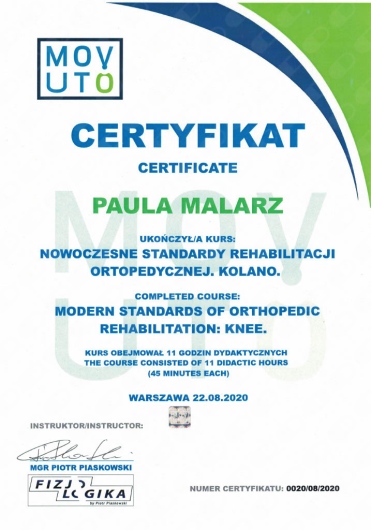 Ponad to uczestniczę w licznych kursach i warsztatach podyplomowych, i stale poszerzam swoją wiedzę, aby rezultaty rehabilitacji moich pacjentów były dla nich widoczne i odczuwalne w ich codziennym życiu.