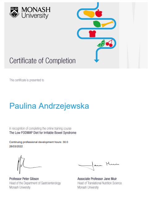 Jestem absolwentką studiów licencjackich i magisterskich na Collegium Medicum w Bydgoszczy, UMK w Toruniu. W ramach pracy dyplomowej zajmowałam się badaniami naukowymi dot. stanu odżywienia pacjentów chorych na celiakię. Doświadczenie zawodowe zdobywałam w poradniach dietetycznych w Bydgoszczy, Chełmnie, Gdyni oraz w szpitalach uniwersyteckich. Ukończyłam szkolenie specjalistyczne dot. diety low FODMAP na Uniwersytecie Monash w Australii, specjalizuję się w dietoterapii w Zespole Jelita Drażliwego. W 2025 roku we współpracy z wydawnictwem PZWL wydałam książkę dla pacjentów pt."SIBO i IBS pod kontrolą. Praktyczny poradnik". Jestem również współautorką publikacji naukowej dot. modulacji mikrobiomu jelitowego w IBS.